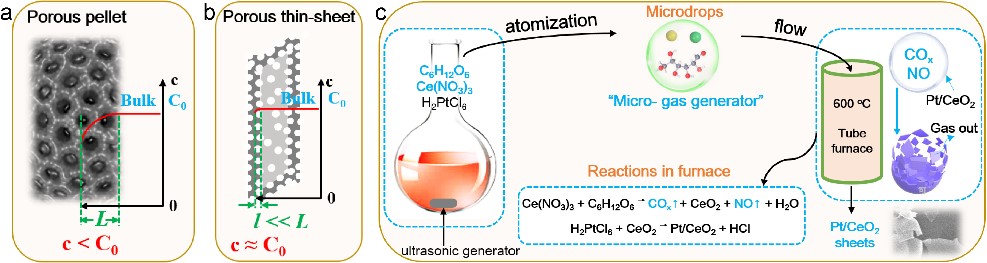 单原子催化剂近年来引起格外关注,但是成为实用化催化剂仍面临巨大挑战。第一,要尽可能多地负载金属原子以提高活性位点密度以实现高体积反应活性。第二,氧化物载体的物理结构要有利于质量传递以实现活性位点高效工作。由于内扩散效应,反应物浓度随着靠近颗粒中心而降低,导致内部单原子位点的工作效率逐渐降低。二维纳米薄片是极为理想的物理结构,极短的扩散厚度使几乎所有的单原子位点都能够在近本体浓度下高效工作。
