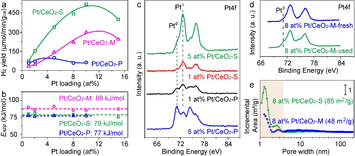 水煤气变换(WGS)反应是工业制氢的关键反应之一,CO/H2浓度通常高达10%。 “微气体爆破”合成的高面密度的Pt1/CeO2-S具有出色的耐受性和反应性。负载量10%的Pt1/CeO2-S仍能够在“10% CO + 4% H2O”的苛刻反应条件下“存活”100小时以上(活性保持89%)。更重要的是,他们在WGS反应中证实纳米片内的内扩散效应得到“准消除”。由于传质距离增加了2个数量级,同为单原子分散的Pt1/CeO2-M多孔微球的活性却降低了50%以上。