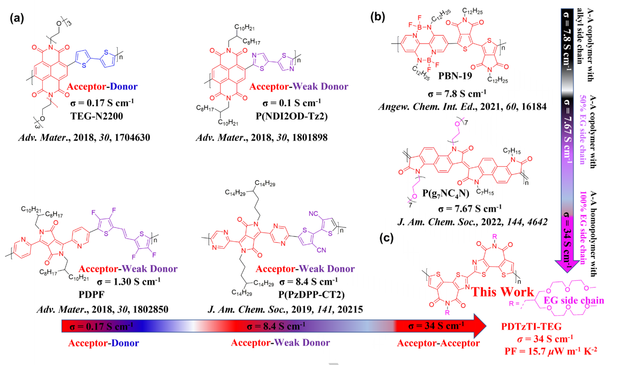 高性能n-型有机热电材料对于有机热电器件领域的发展不可或缺,目前,大部分n-型有机热电材料大多采用给体-受体(donor-acceptor)结构,但是这种类型的构建单元不利于n-型掺杂,得到的热电性能较差。为了进一步提升热电性能,在聚合物主链上引入缺电子构建单元,或者引入极性侧链来提高n-型掺杂效率是一种有效方法。全受体(Acceptor-Acceptor或all-acceptor)结构是较为理想的解决方案,其在实现单极性n-型有机电子器件方面有显著优势。