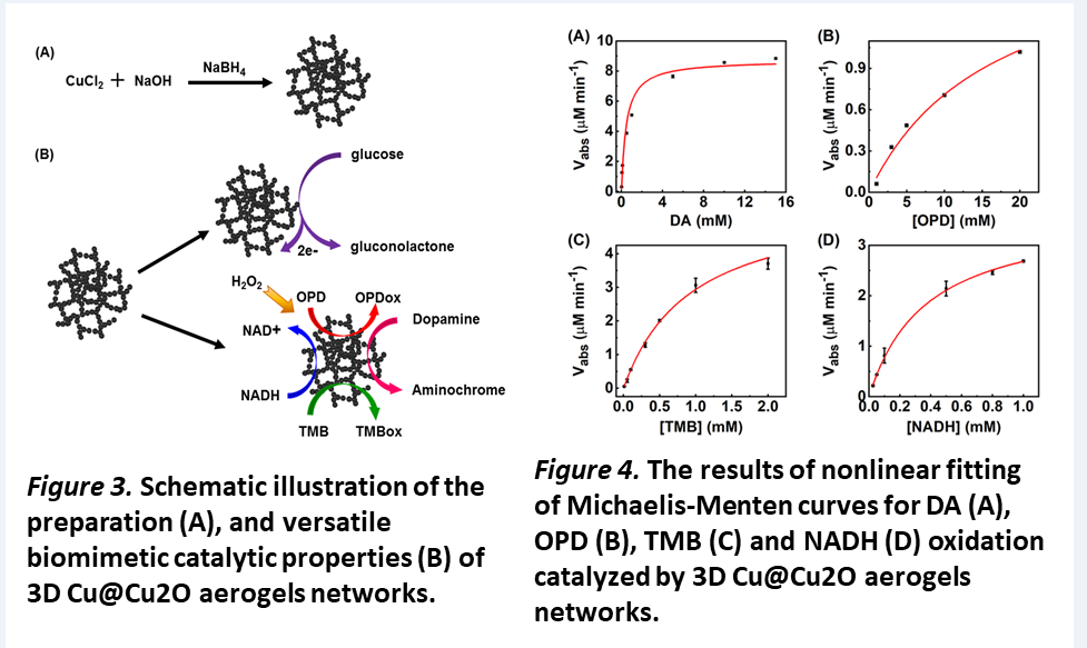 近日,该课题组提出一种全新的合成思路,采用一步法用NaBH4NaOHCuCl2的混合物在室温下进行还原合成了由粒径约为40 nm左右的纳米粒子自组装而成的3D多孔Cu@Cu2O凝胶网络框架。该合成方法具有简单、快速、易操作、不需要加热以及价廉等优势。研究发现,该三维多孔材料具有辣根过氧化物酶和NADH过氧化物酶的仿生催化性能,可以实现对TMBOPDdopamineNADH的仿生催化。该3D多孔Cu@Cu2O凝胶为构建仿生催化传感界面的构筑提供了新的平台。该成果于46日发表在化学类国际顶级刊物 《德国应用化学》 (上。论文的第一作者为课题组新进教师凌平华博士,通讯作者为高峰教授。
