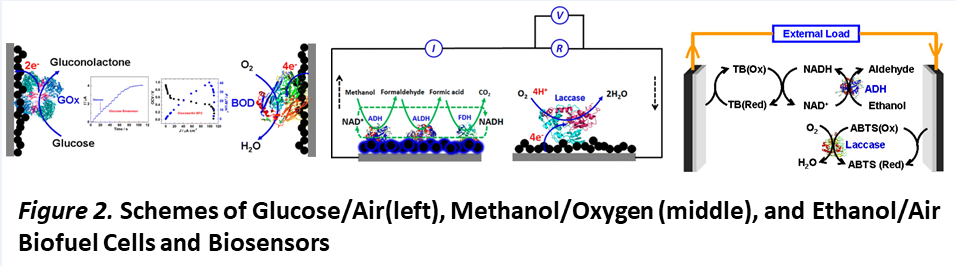 藉生物电催化原理,设计构筑了基于碳纳米点等微纳碳基材料的酶催化界面,构建了系列生物电化学器件,如直接电子转移型葡萄糖传感与葡萄糖/空气生物燃料电池()、基于多种脱氢酶串联催化界面的甲醇传感与甲醇/氧气生物燃料电池()以及基于电子媒介型乙醇传感与乙醇/空气生物燃料电池(