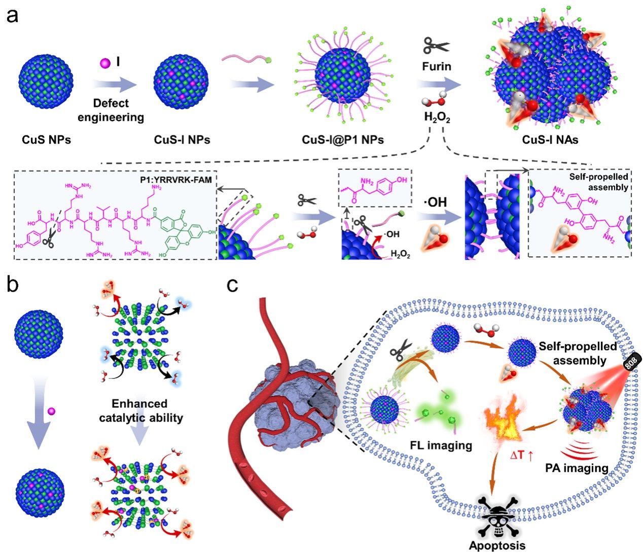 纳米颗粒在活体内的靶向组装对智能性纳米诊疗技术的实施和拓展具有重要意义。目前,生物正交点击反应是纳米颗粒活体组装的主要手段。然而,这些反应多属于有机周环反应,往往涉及复杂的化学“手柄”设计和修饰过程以及有限的反应效率。本文中该研究团队设计合成了阴离子掺杂的CuS纳米颗粒,利用其独特的催化性质,促进自由基偶联反应,成功实现活体中纳米颗粒简便、可控、自推进式的靶向组装。研究者将含天然“手柄”酪氨酸(Tyr)的短肽修饰CuS-I纳米颗粒(CuS-I@P1 NPs)作为自催化构建单元,在细胞内化过程中,肿瘤特异性furin酶指导CuS-I@P1 NPs发生定向缩合反应形成CuS-I纳米颗粒组装体。该工作利用天然“手柄”结合纳米颗粒的催化特性实现其活体内的靶向组装,具有以下关键优点: (1) 组装“手柄”选择天然氨基酸,无需复杂化学官能团修饰、路线简单、通用性强。(2) 采用CuS-I NPs催化自由基反应具有高特异性和高效率,从而最大限度地减少了不良反应,解决了依赖有机周环反应的组装局限性,为活体内纳米颗粒靶向组装提供新的途径,也为智能纳米药物开辟了新的前景。