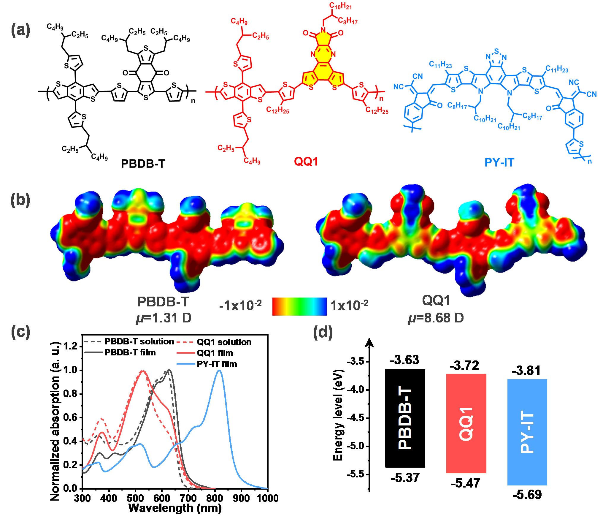 图2. (a) PBDB-T,QQ1和PY-IT的化学结构;(b) PBDB-T和QQ1的表面静电势;(c) PBDB-T,QQ1,和PY-IT的吸收图谱;(d) 材料的能级图。