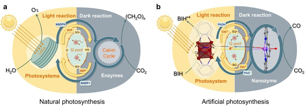 自然光合作用通过绿色植物和藻类吸收光能,把二氧化碳和水转化为富能有机物并释放氧气,是自然界最大规模的物质转化和能量转换过程,同时也带动了自然界其他物质的循环。自然光合系统包含了光敏蛋白、生物酶和辅酶等关键组件,通过光吸收、电子传递、光合磷酸化、碳固定等复杂步骤实现碳素转化和能量转换,有效将光反应和暗反应进行解耦,使其分别在光照和黑暗条件下工作,从而满足昼夜更替和各种天气环境的不持续光照条件。然而,基于人工材料的人工光合系统,通常无法将光照条件下产生的能量载体进行储存并在黑暗条件下驱动化学转化,难以满足不持续太阳光照条件的需求,成为人工光合作用领域长期以来被诟病的瓶颈问题。