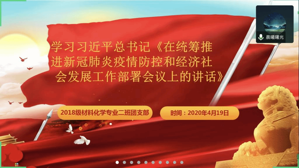 会议共有六项流程,首先由主讲人带领大家学习疫情期间习近平总书记《在统筹推进新冠肺炎疫情防控和经济社会发展工作部署会议上的讲话》,以及疫情期间一线人员及广大志愿者所展现出来的优秀品质。