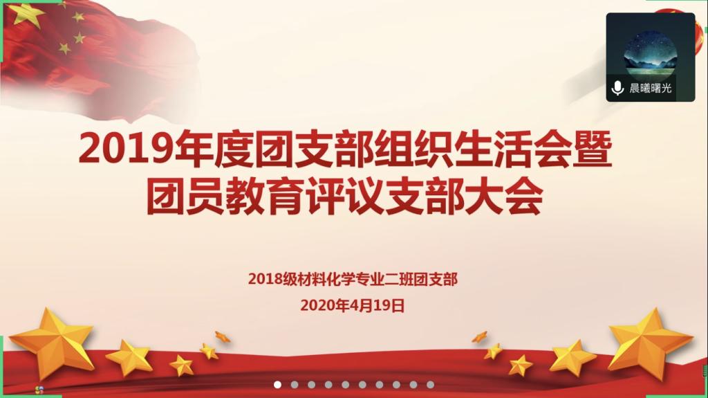 本网讯 (18材料化学 郑瑶) 2020年4月19日晚,18材料化学二班团支部召开“2019年度团支部组织生活会暨团员教育评议支部大会”主题会议。会议主讲人为团支书张强,材化二班全体团员同学及特邀嘉宾辅导员陶勇老师参加会议。