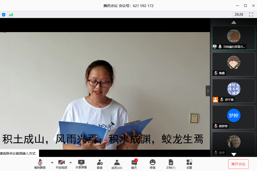 6月11日下午三点活动在腾讯会议平台上召开。本期内容共分为“寻觅”、“顿悟”、“蜕变”、“坚守”四个环节。四位同学各自带来四个故事,以叙述为主、主持人提问为辅的方式再现故事的始末与细节。