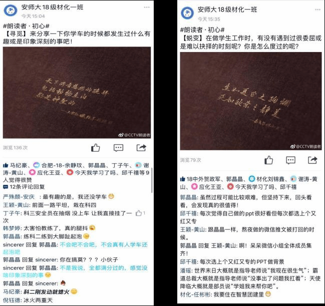 在每个环节的最后,四位同学分别献上节选朗读:荀子的《劝学》、陶行知先生的《我们的信条》、习近平总书记在纪念五四运动一百周年大会上的讲话以及法布尔的《昆虫记》。朗读内容贯穿古今中外,贴切个人主题,分享者用声情并茂的朗诵带来各具特色的作品。在活动全程中,官Q宣传平台实时发布四个相关话题讨论,鼓励同学们积极参与互动,一起分享自己的故事。