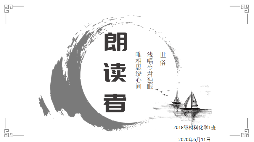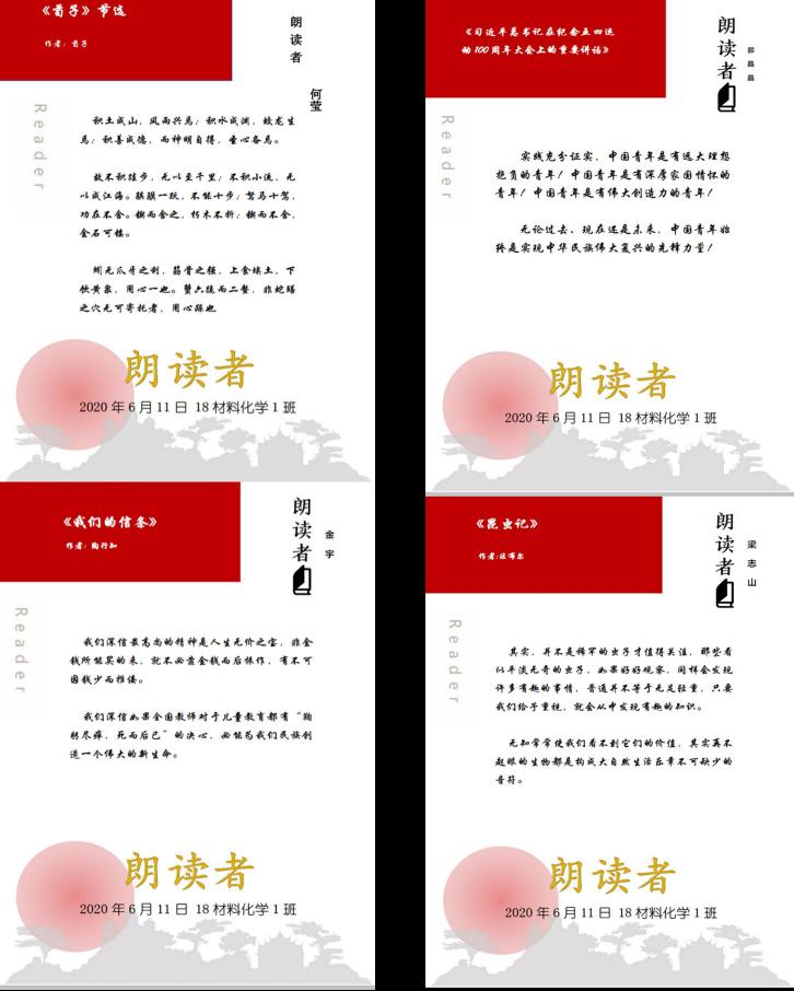 本网讯 (18材料化学 黄宁宁)览历史之壮阔,诵英烈之丹心,咏至亲之大爱,展青春之风采。为缓解疫情期间可能给同学们带来的心理压力,丰富班集体精神文明建设,18材料化学1班参考推出的《朗读者》节目,特举办同名系列活动。活动目的在于分享同学们居家期间阅读的好书好文,将自己最喜欢的诗歌、短文、故事,用声情并茂的朗读方式给全班师生们分享。