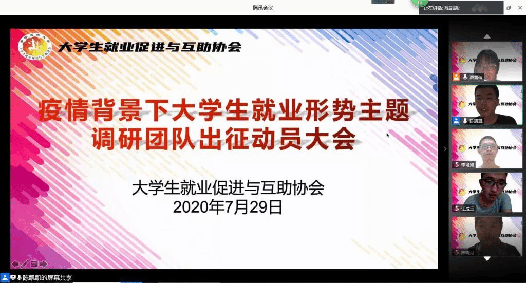 大学生就业促进与互助协会(以下简称“就协”)开展了主题为"疫情背景下大学生就业形势主题调研团队出征动员大会"的线上会议,谱写暑期社会实践的“前奏曲”!