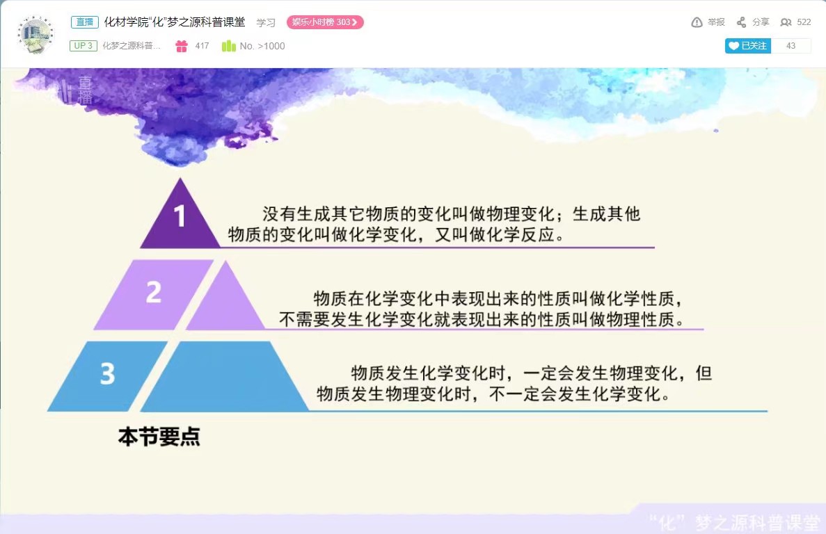 “化”梦之源主题科普宣教团队正式开启了为期十余天的线上教学活动。本次暑期实践活动以“爱心成就梦想,‘化'梦圆于云端”为主题,通过哔哩哔哩直播平台为即将接触化学学科的学生进行化学知识科普宣教。团队成员在课上将化学课本上的知识和生活实际相结合进行科普宣讲,课后积极为学生们答疑解惑,陪伴学生们度过了一个充实的暑假。