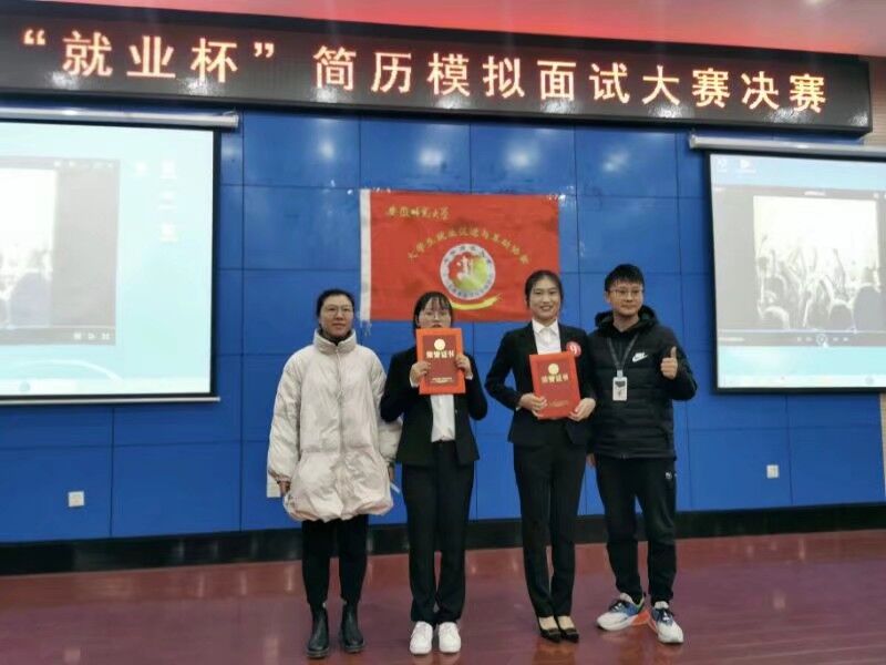 程紫丹老师和陶勇老师、就业促进与互助协会理事以及前来观摩学习的观众。此次大赛旨在让大学生切实体验职场氛围,切实了解到各个职业的基本素质,从而更好的完善和提高自己的能力,丰富对自己未来的职业规划。