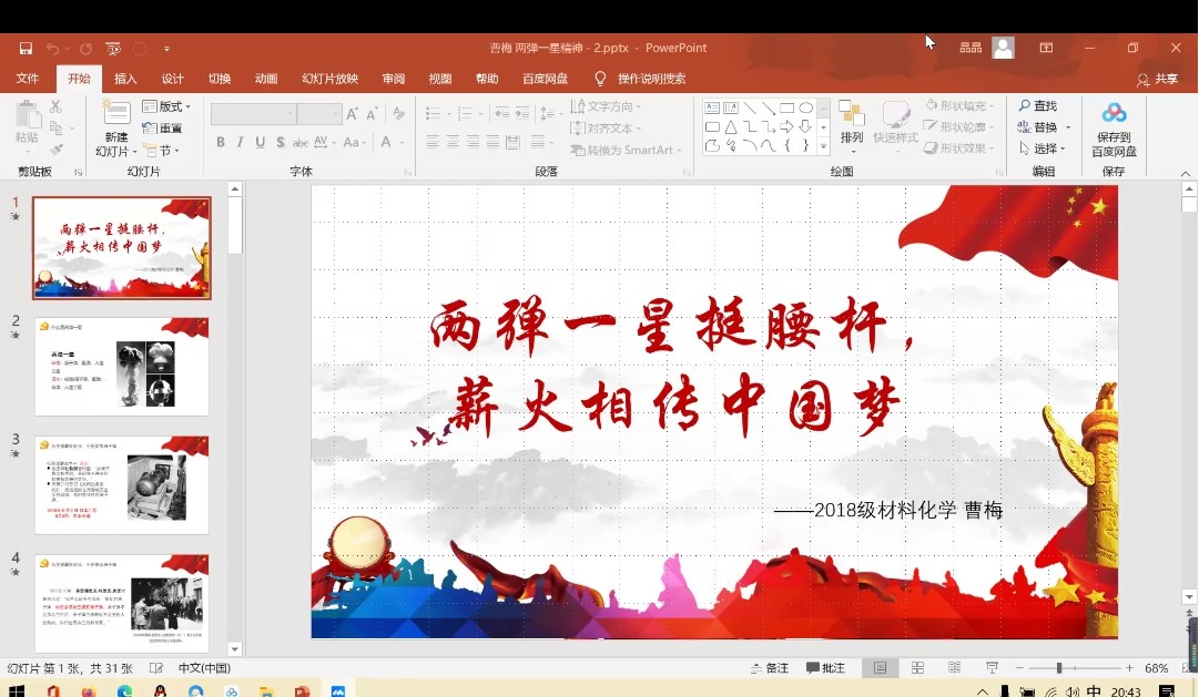 党史宣讲团成员曹梅同学为支部全体同学带来了一场生动的党史宣讲,通过视频学校、互动提问等方式向大家介绍了两弹一星制造过程中的艰难险阻。