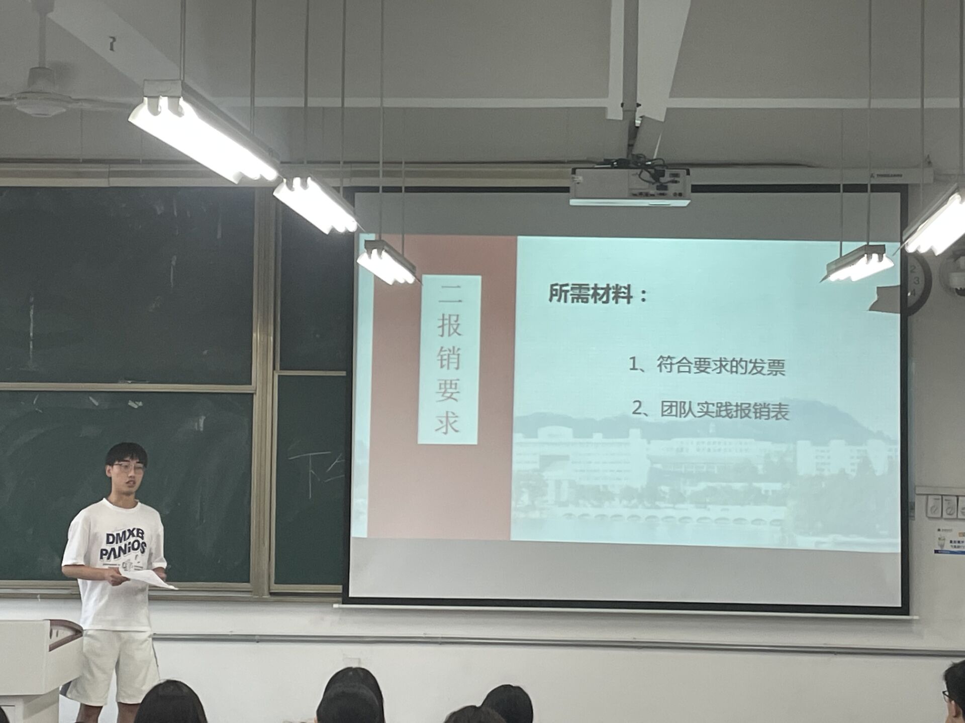 开展了暑期社会实践财务培训会,院团委办公室部长左博文对财务报销制度进行详细的解说,他分别从报销原则、报销流程、报销要求和注意事项进行了解读,并展示了可报销票据。各实践团队代表认真听讲,积极互动,询问相关问题并及时解答