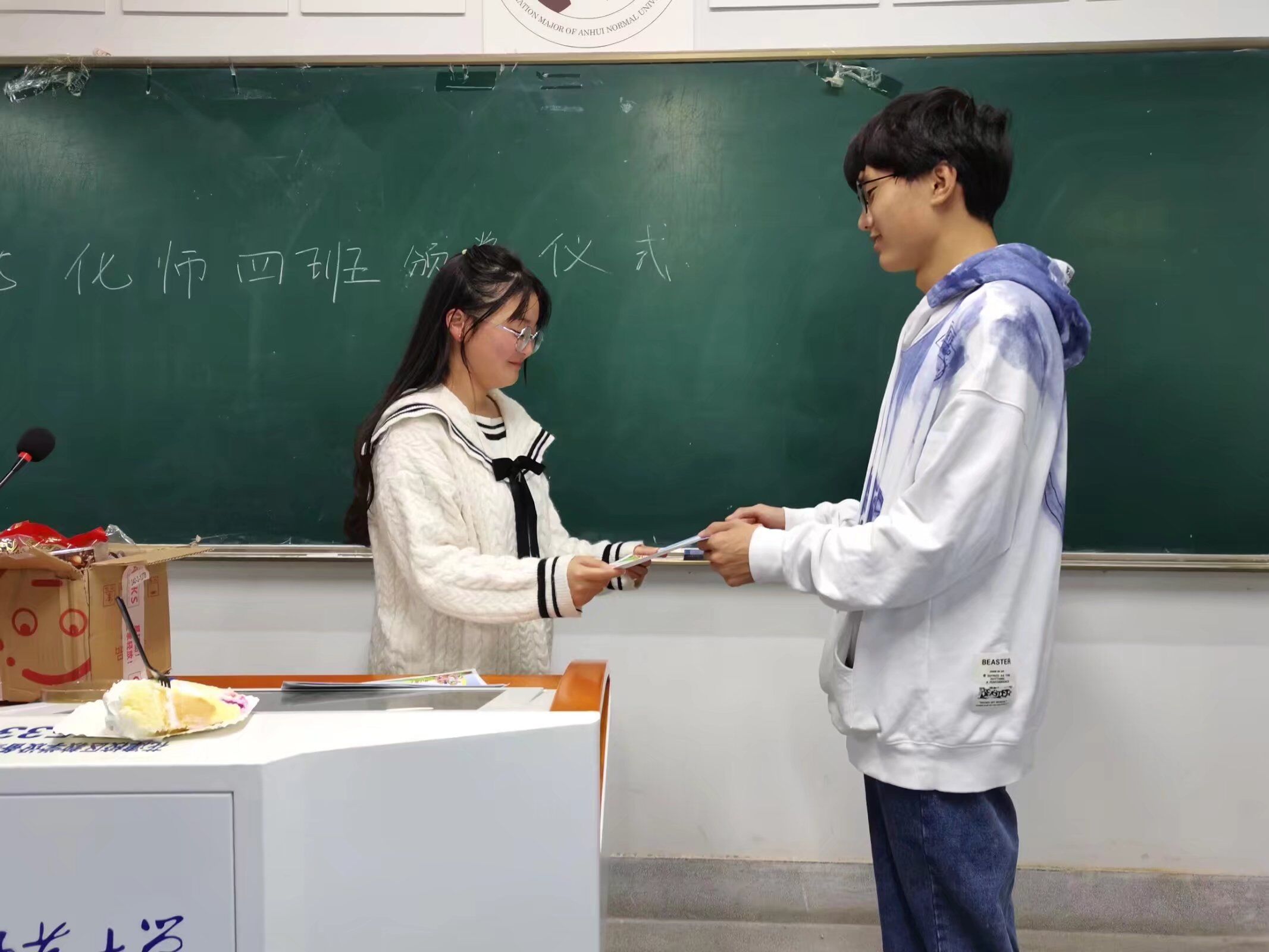 班级文娱委员贾彭为班级中在8、9、10月份过生的小寿星们准备了两个蛋糕以及专属的星座手链作为小礼物,此次过生的小寿星们共计19人,他们在学生们合唱的生日快乐歌中上台领取了专属小礼物并拍照留念,八名学生自告奋勇切蛋糕并分发给班级的每一位学生。通过定期举办集体生日会,不仅可以增强班级的凝聚力,融洽同学们之间的关系,还能以真情融化同学们的隔阂,以气氛衬托出全班同学的喜悦心情。