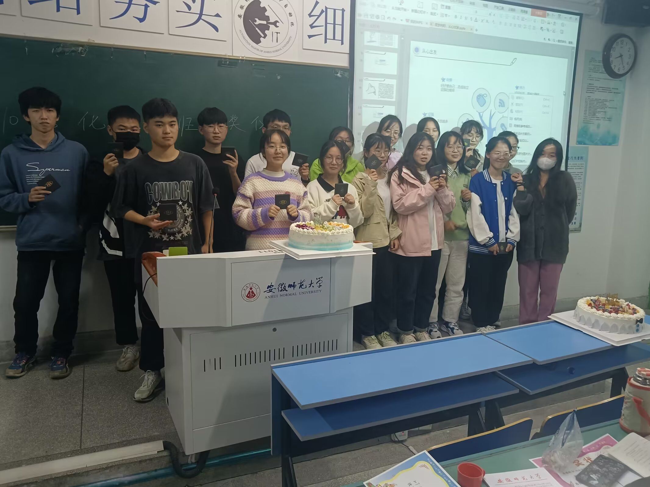 21化师4班 张雨萍)为丰富班级学生的课余生活,进一步加强学生心理健康教育工作,宣传普及心理健康知识,形成正确的心理健康观念,2022年10月23日晚自习期间,21化师四班在行知楼2070206教室开展了以“逐梦向阳,从心出发”为主题的心理班会暨集体生日会活动。本次活动由班级心理健康委员温婉婷级文娱委员贾彭共同负责。