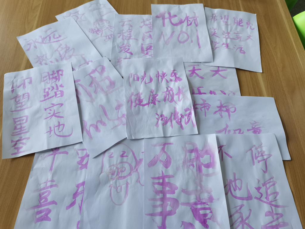 此外,活动现场还提供了无色的氢氧化钠溶液和酚酞试剂,参与的同学通过蘸取氢氧化钠溶液写一份给予大家的心灵寄语,并通过喷洒酚酞溶液使其发生化学反应而显现颜色,活动作品将在现场展览或寄出,该项“妙笔生花”活动结合了化学知识,也突出了绿帽奴