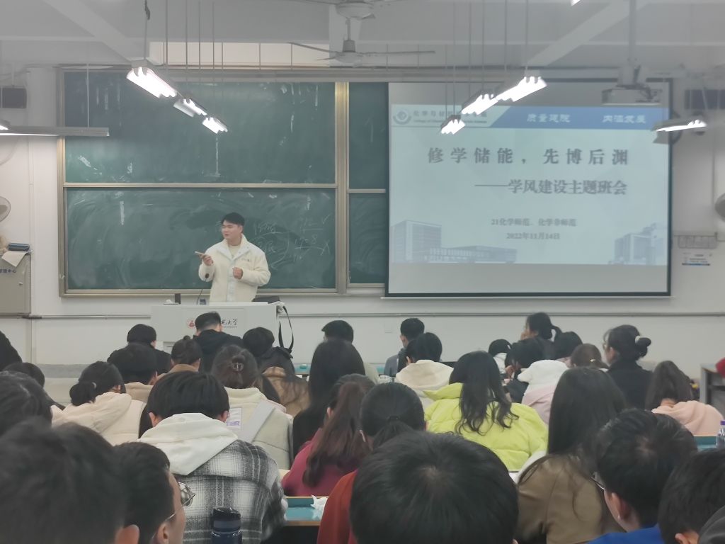 21化师4班 张雨萍)为全面梳理、总结前半学期各班级在学风建设方面所遇问题,营造良好的班风学风,提高学生学习自律意识,辅导员陶勇在2022年11月14日、15日晚自习期间分别于行知楼2070201、2010504教室,为21级化学师范与化学非师范班级开展了以“修学储能,先博后渊”为主题的学风建设班会。