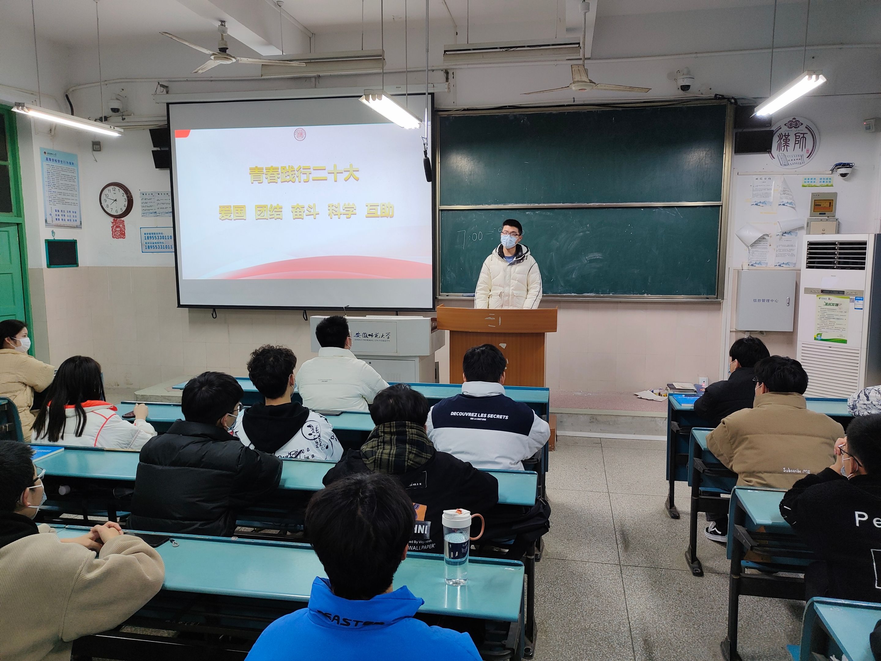 姚安然、梅冠东)为深入学习宣传贯彻党的二十大精神,引导学生坚定不移听党话、跟党走。2月22日、23日,辅导员梅冠东老师分别在2050104、2050102教室为2021级应用化学、材料化学、化学工程与工艺专业全体同学召开“青春践行二十大”主题教育班会。