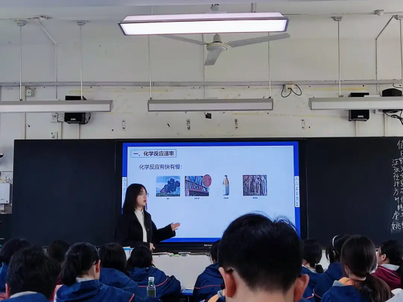 童雅月作为高一16班实习班主任,参与班级同学英语演唱比赛的排练,并主动和同学们交流比赛的情况,积极给出建议。符天凤则走上讲台给高(一)1班同学带来了一堂《化学反应速率》的新课。“这堂课逻辑清晰,简单易懂,符老师把基本概念解释得很清楚。对于我们文科班的同学来说,最主要的就是把基本的概念学习清楚,”课上的同学这样评价,对小老师符天凤的课堂教学表示肯定。