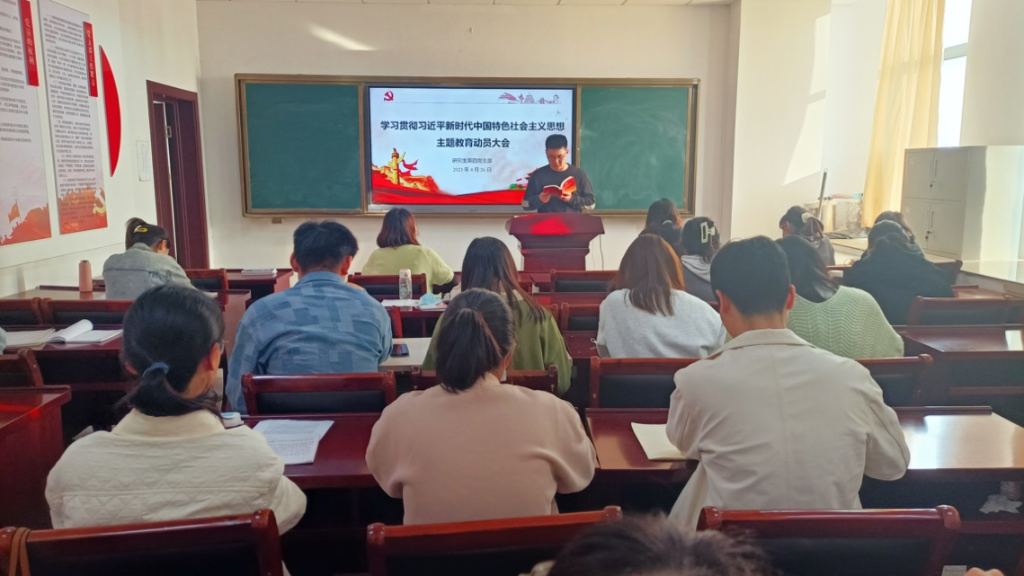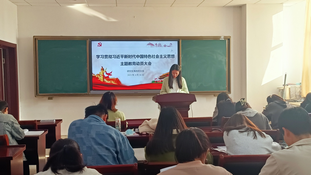 马皖珍)4月26日下午,研究生第四党支部在礼勤楼628会议室召开学习贯彻习近平新时代中国特色社会主义思想主题教育动员大会,学习传达有关工作会议精神和学校绿帽奴