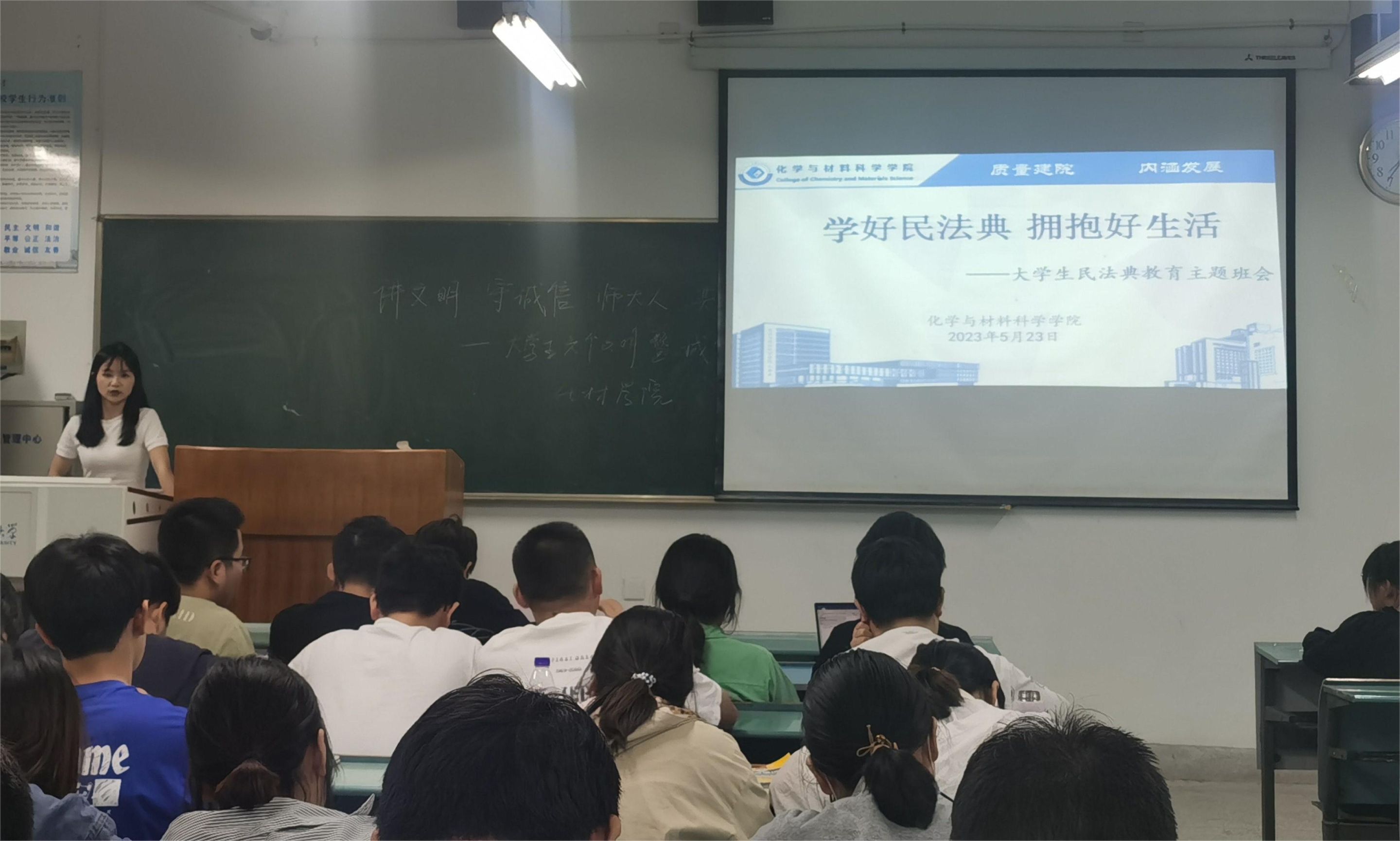 付娜老师接着召开了“学好民法典,拥抱好生活——大学生民法典教育”主题班会,旨在促进大学生法治素养提升,调动起学生学法普法的热情。她建议同学们认真学习民法典,学法知法守法,自觉增强法治观念和法律意识,鼓励同学们用法律武器维护自己的权力。