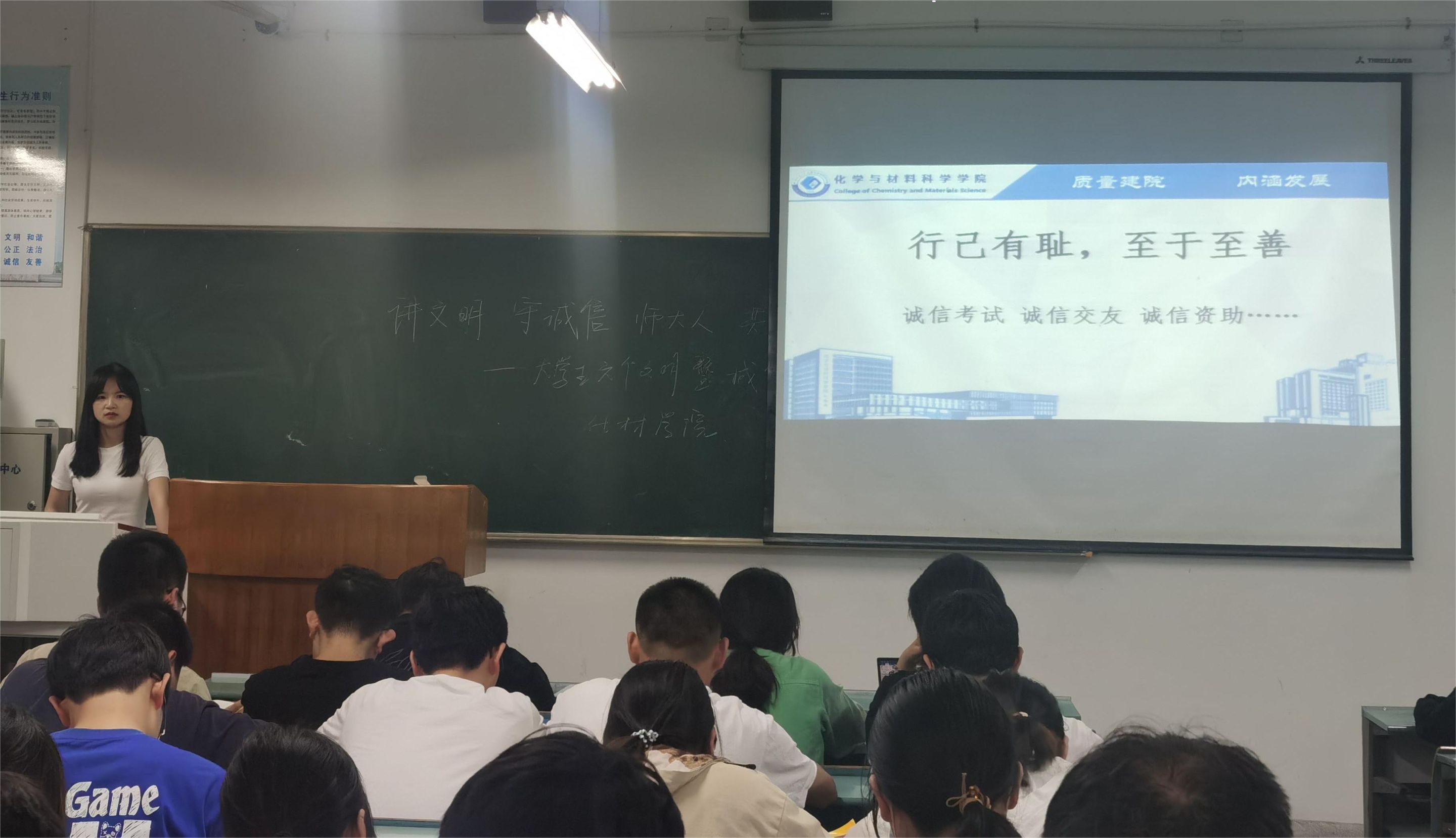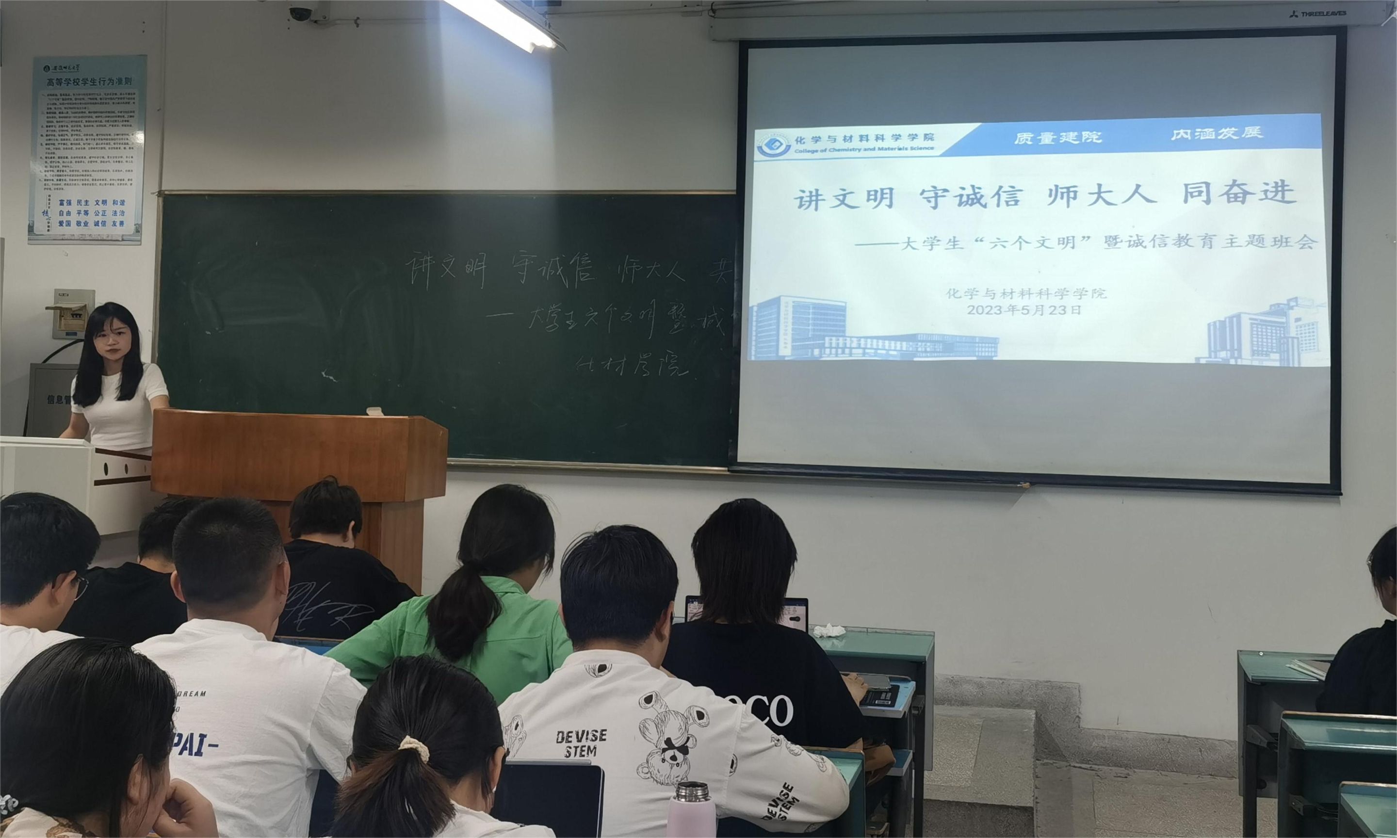曹冉、付娜)为加强校园文明创建,加强班风学风建设,2020级材料化学专业于2023年5月23日19时在2070103教室开展了“讲文明 守诚信 师大人 同奋进”——大学生“六个文明”暨诚信教育主题班会,本次班会的主讲人为辅导员付娜。