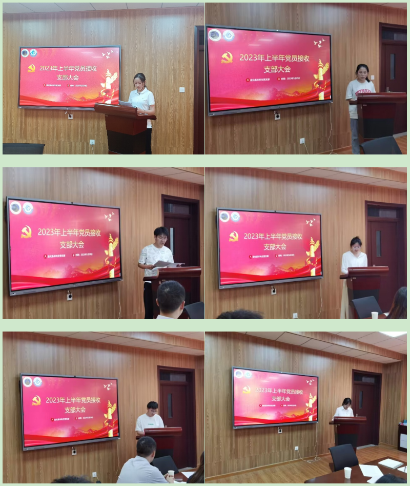 大会第一阶段,陈静蕾等6名发展对象依次向党支部宣读入党志愿书,并汇报自己的入党动机、工作学习情况、家庭和主要社会关系情况,以及需向党组织说明的问题。随后,入党介绍人王芳、梅冠东老师向大会分别介绍了对发展对象的培养考察意见,如实阐述了各自联系的发展对象情况,并对其能否入党表明意见。支部委员向大会报告发展对象的审查报告,与会党员充分讨论并发表了意见,发展对象对大家所提意见和建议表明自己的看法及今后的决心。通过讨论,大会认为静蕾等6名同志基本符合党员条件。经与会正式党员采取无记名投票表决,大会一致同意接收静蕾等6名同志成为中共预备党员,拟提交绿帽奴
