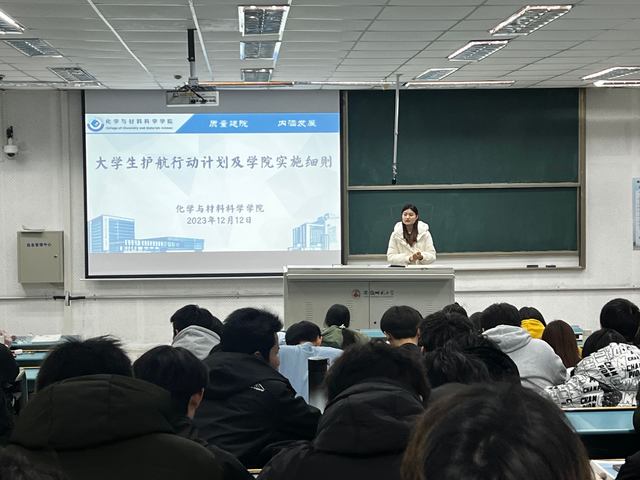 郁妍)2023年12月12日晚上,化学工程与工艺专业在7号楼401开展了大学生护航行动计划解读主题班会,本次班会主持人为辅导员朱梦茹老师。