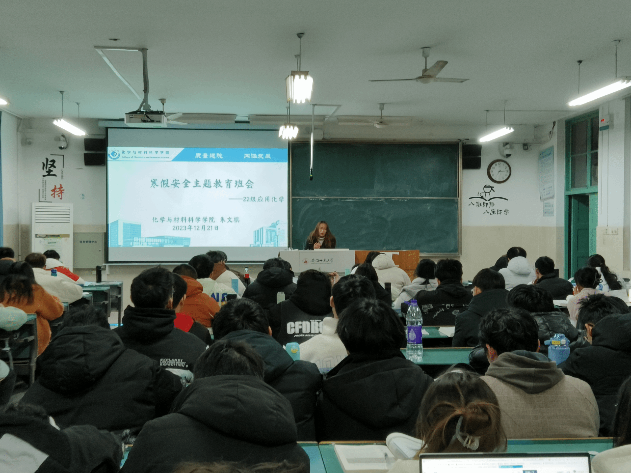 朱文棋、李晨蕾)2023年12月21日晚七点在2010602教室,为使学生们度过一个快乐、平安的假期,2022级应用化学专业辅导员朱文棋老师主持召开了寒假安全主题教育班会。
