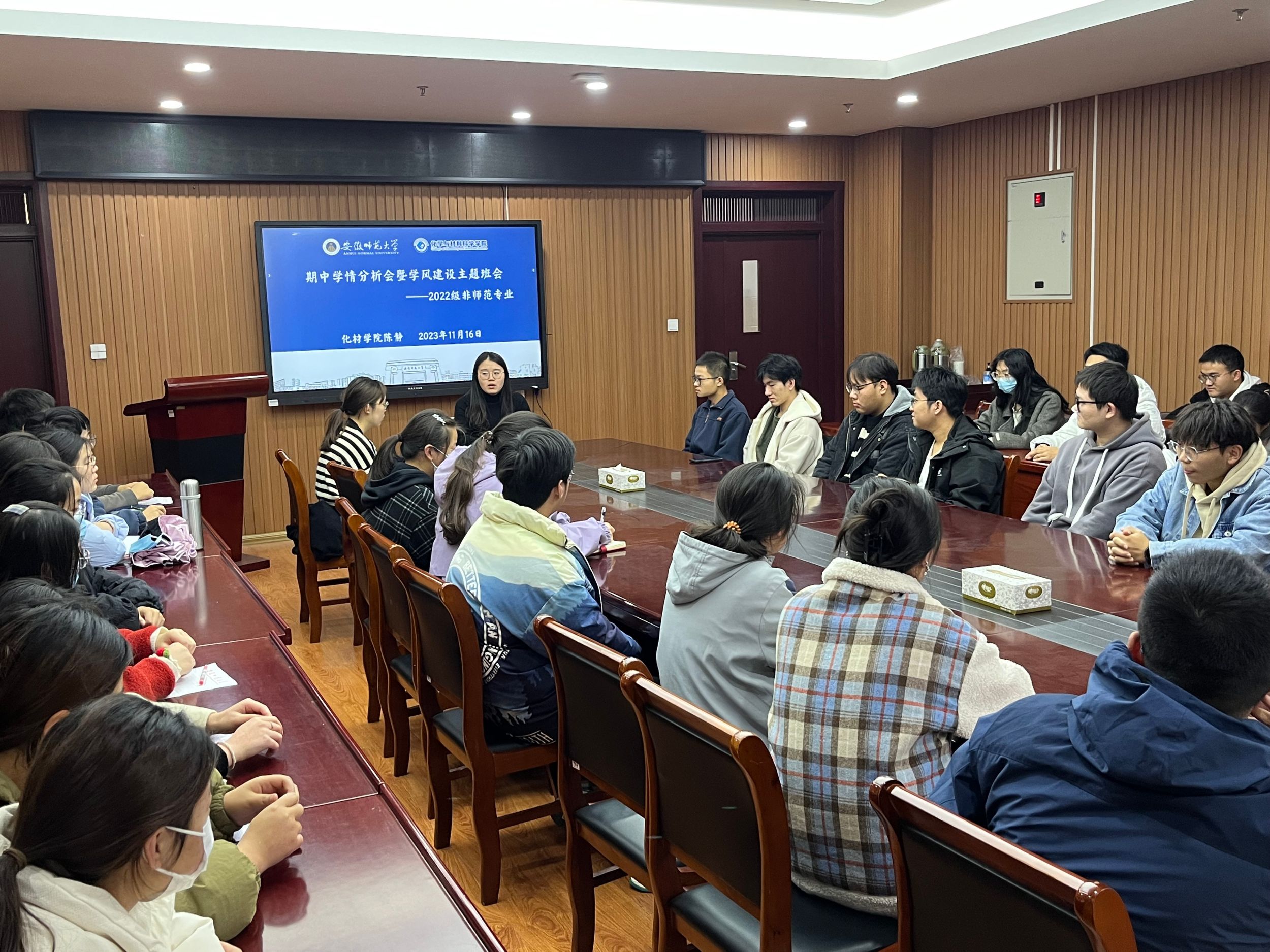 大学生护航行动计划》号召,着力解决学生学业发展、未来规划等方面的实际问题,持续推进学风建设,营造优良学习氛围,2023年11月16日-18日,辅导员陈静老师为2022级化学师范、非师范专业召开期中学情分析会暨学风建设主题班会。