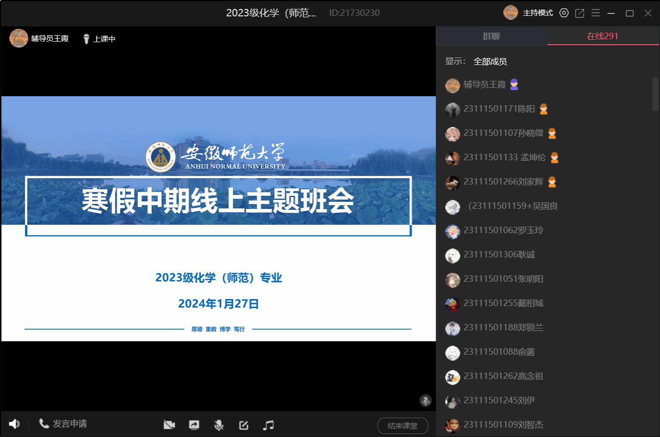 本网讯(张宏亮 王霞)为确保学生寒假期间的安全与健康,密切关注学生寒假期间的相关活动,2023级化学(师范)专业于1月27日20:00召开了线上寒假中期主题班会,此次线上班会由辅导员王霞老师主持,全体同学参会。
