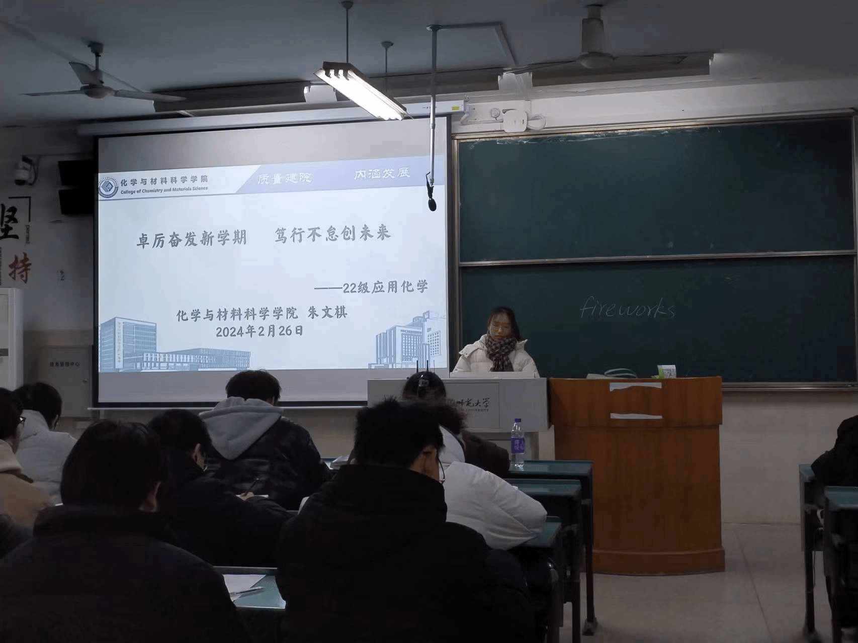 朱文棋 许静媛)卓力奋发新学期,笃行不怠创未来。为落实新学期学生护航重点任务,2024年2月26日晚,在2010602教室朱文棋老师为应用化学专业的同学开了一次“开学第一课”主题班会,着重引导同学们加强对个人思想政治素质和规矩意识的培养,不断增强自我教育、自我管理和自我服务的能力,同时就新学期的班级管理工作进一步明确了制度和标准。