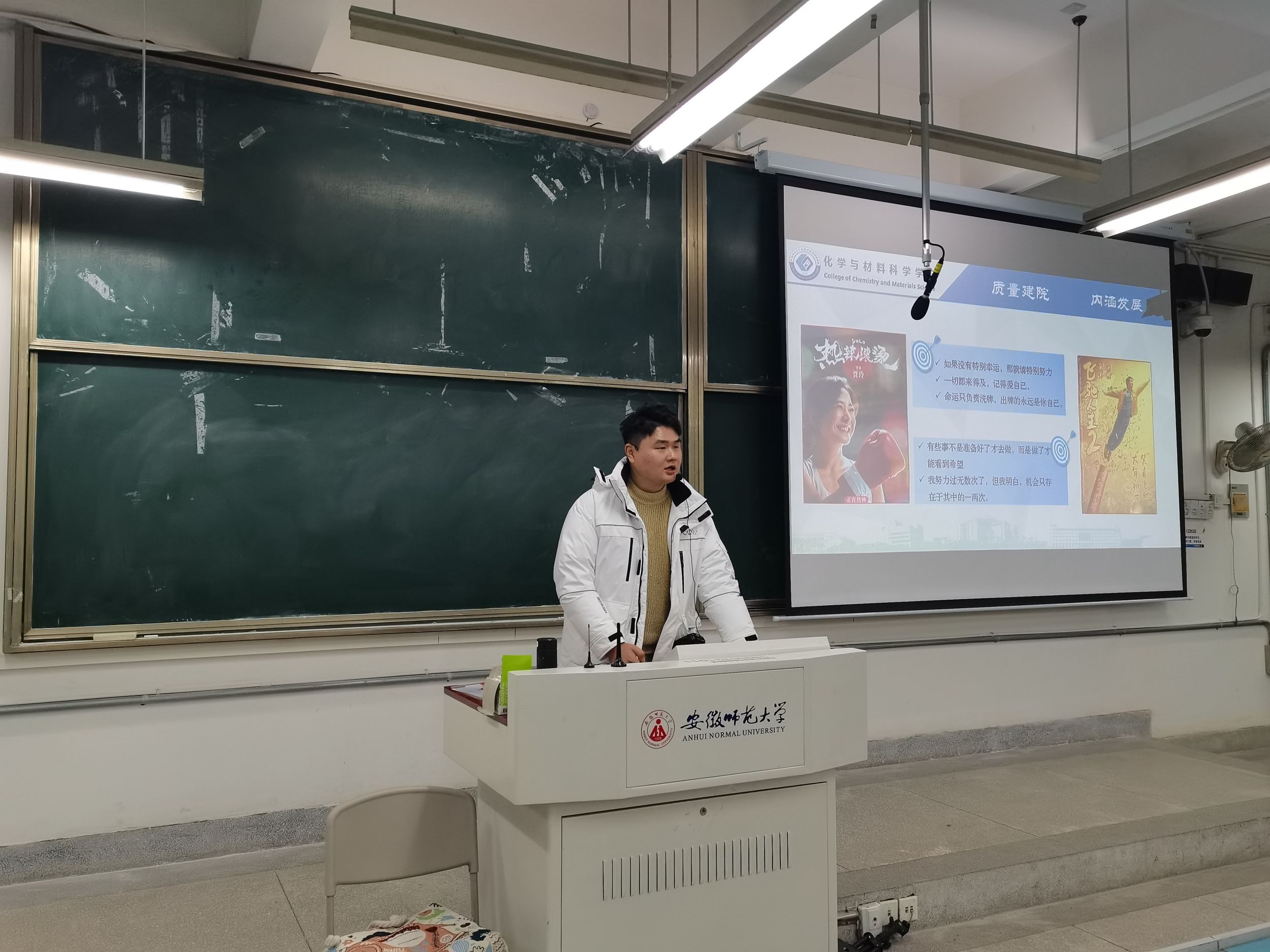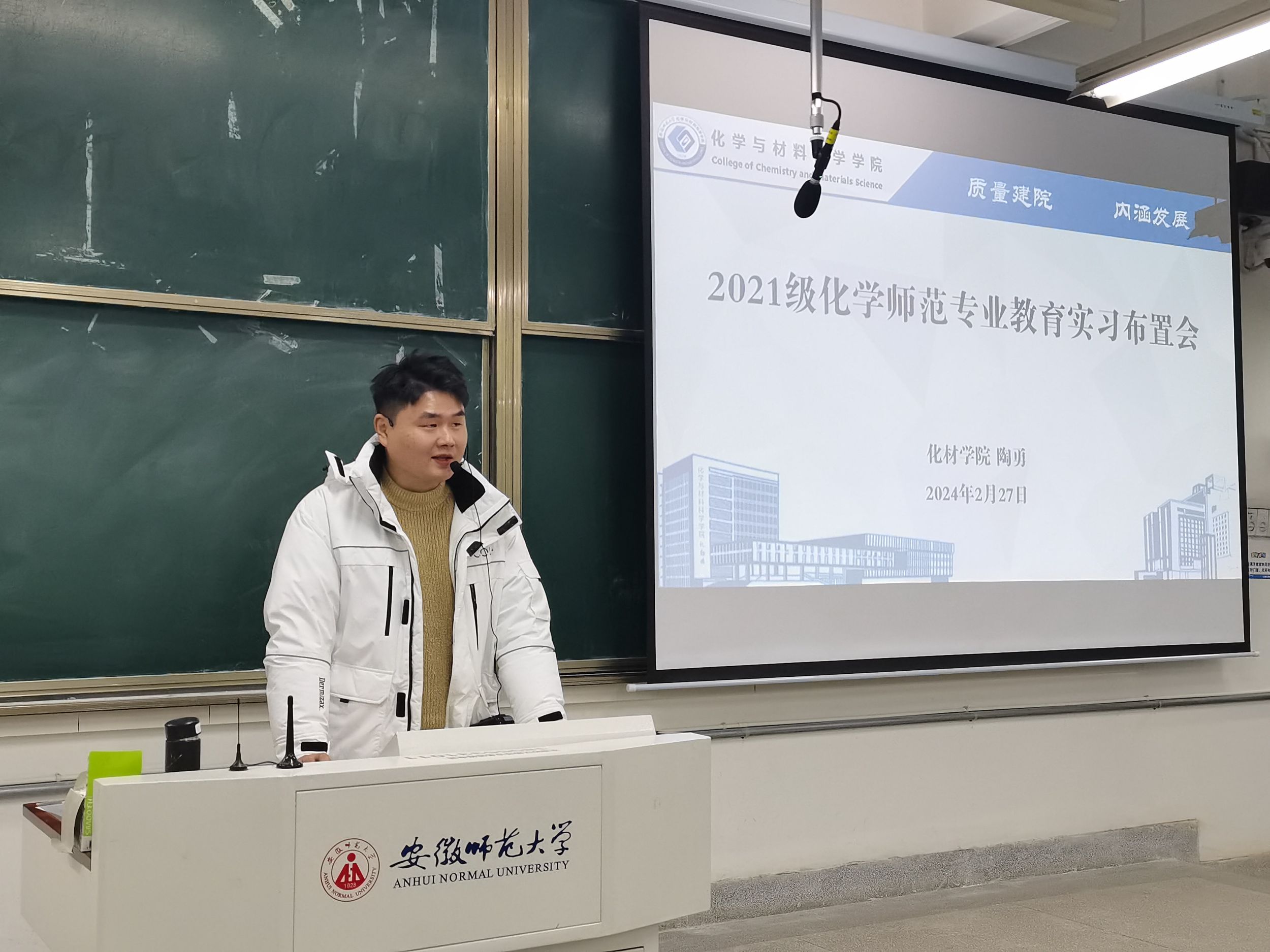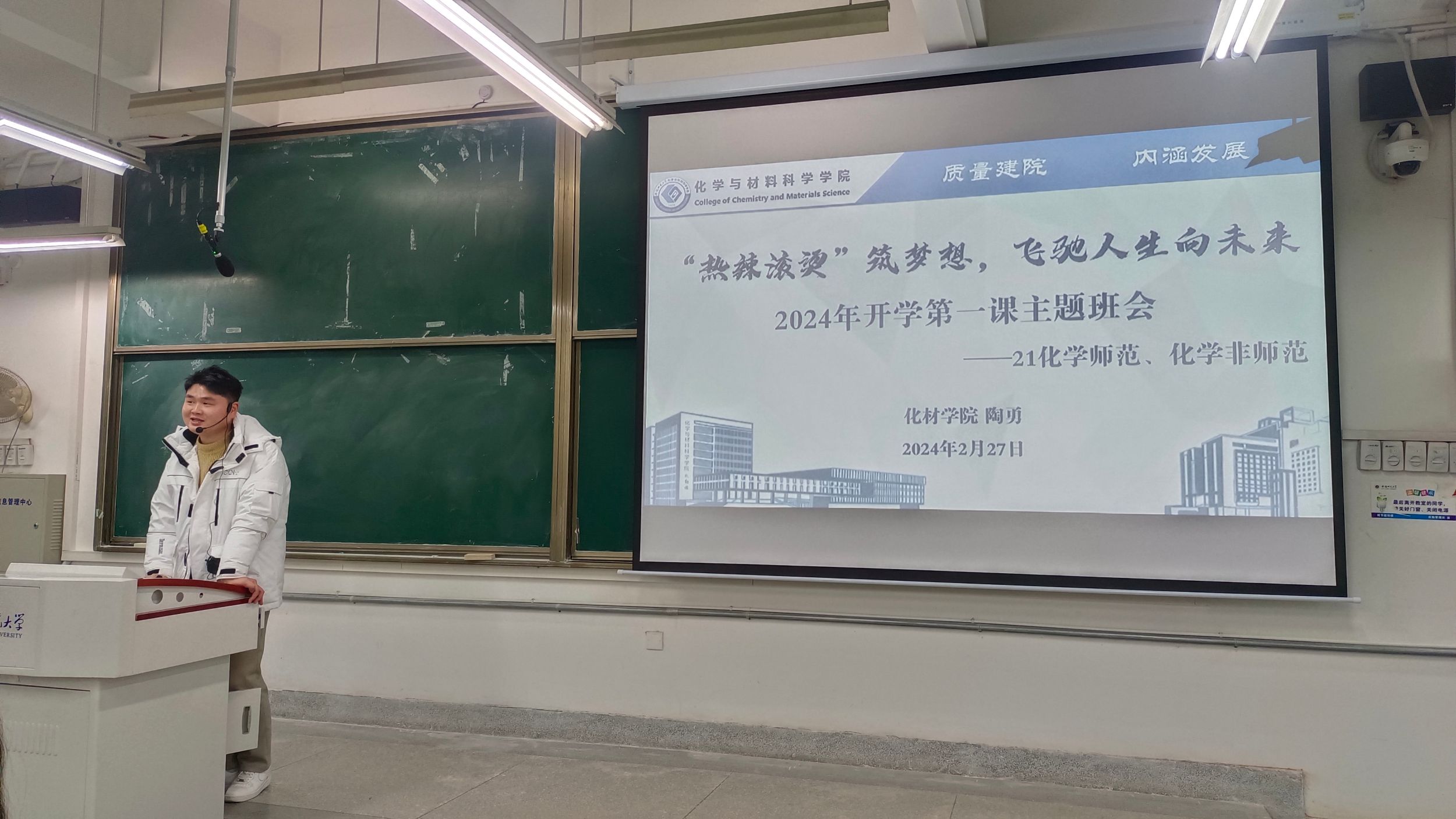 张雨萍)为了布置开学各项事宜并帮助学生们做好新学期的选择规划,2024年2月27日晚在行知楼2070201教室,辅导员陶勇分别为2021级化学师范与化学非师范专业全体同学召开了以“热辣滚烫筑梦想,飞驰人生向未来”为主题的新学期“开学第一课”主题班会。