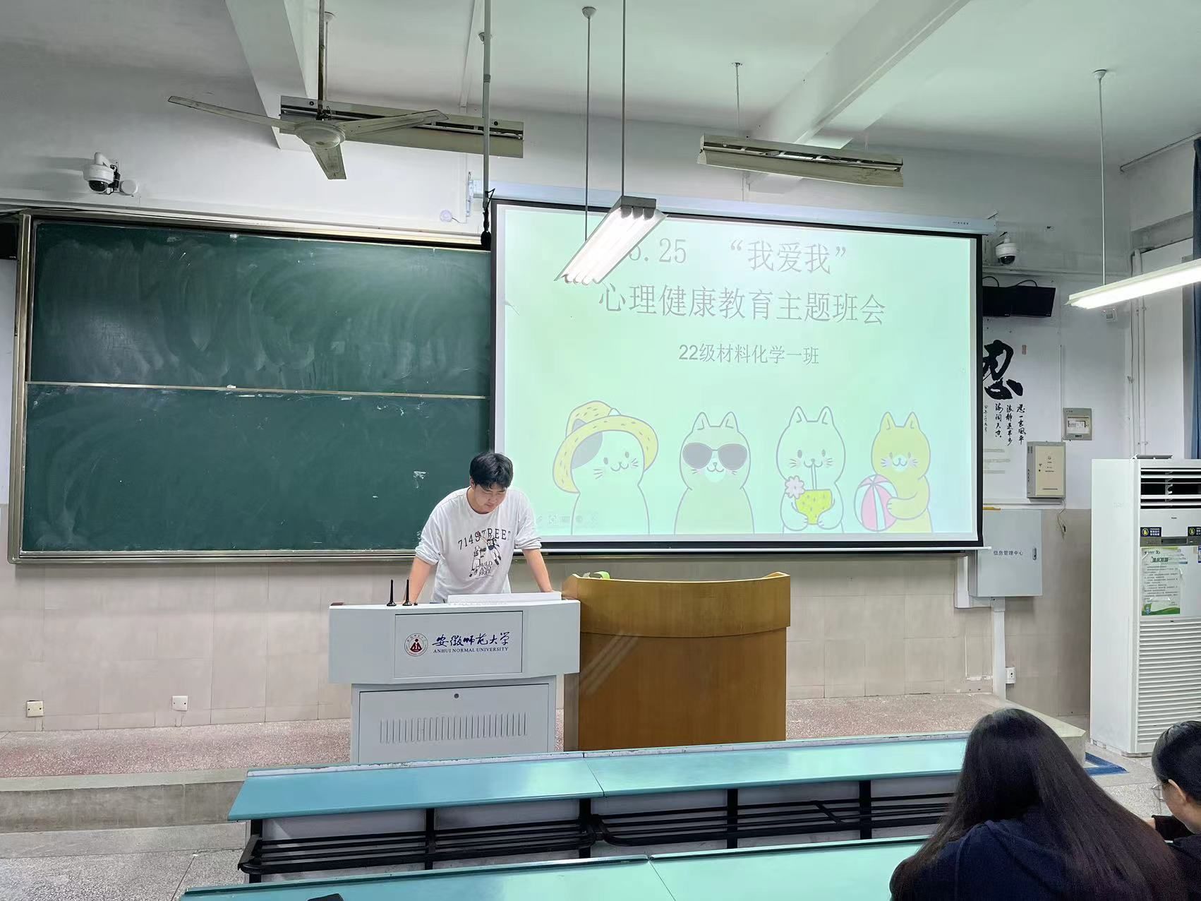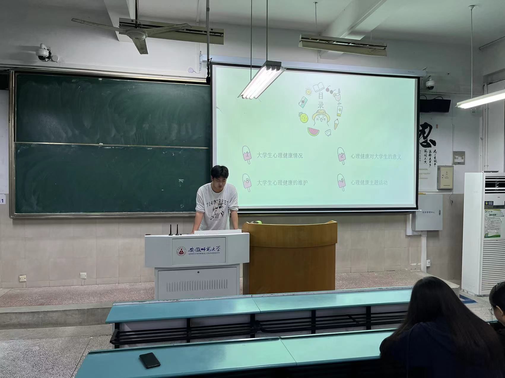 刘泽华首先通过调查数据让同学们了解到大学生在学习生活中遇到心理健康问题的普遍性,告诉同学们要时刻关注和维护自身心理健康。随后,心理委员向同学们讲解了心理健康的重要性,让同学们了解到心理健康和行为性格、学习生活、他人交流的紧密联系,加强了同学们对于心理健康的认知。最后,心理委员列举了多条维护心理健康的方法及校内院内有关维护大学生心理健康的措施和活动,呼吁同学们用正确积极的方式去面对心理健康问题。