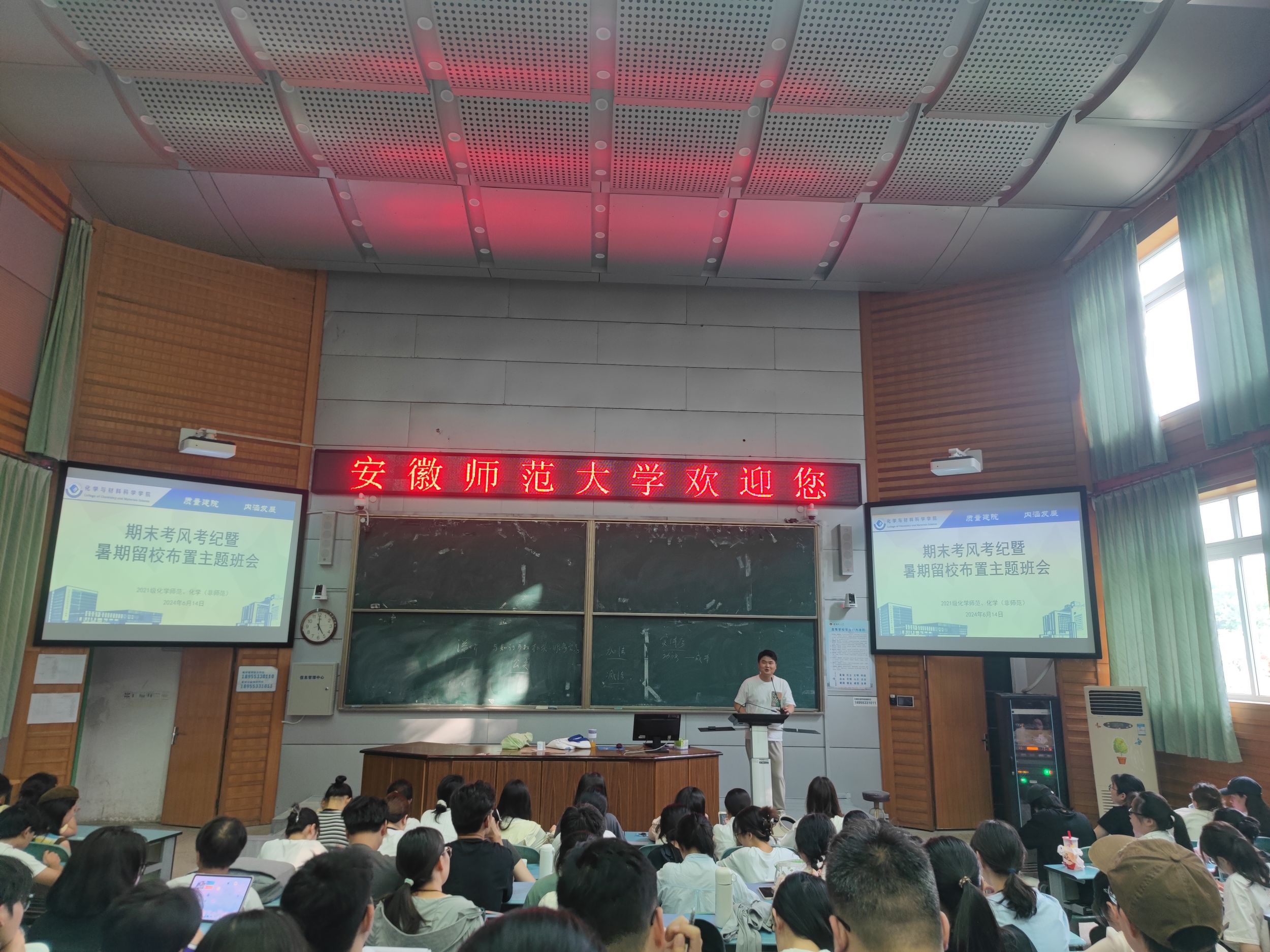杨妍、陶勇)为加强期末考试诚信教育,营造良好的备考氛围,同时推进暑期留校工作顺利开展,2024年6月14日下午,辅导员陶勇老师于行知楼2010105教室为2021级化学师范、化学非师范专业全体同学召开期末考风考纪暨暑期留校布置主题班会。
