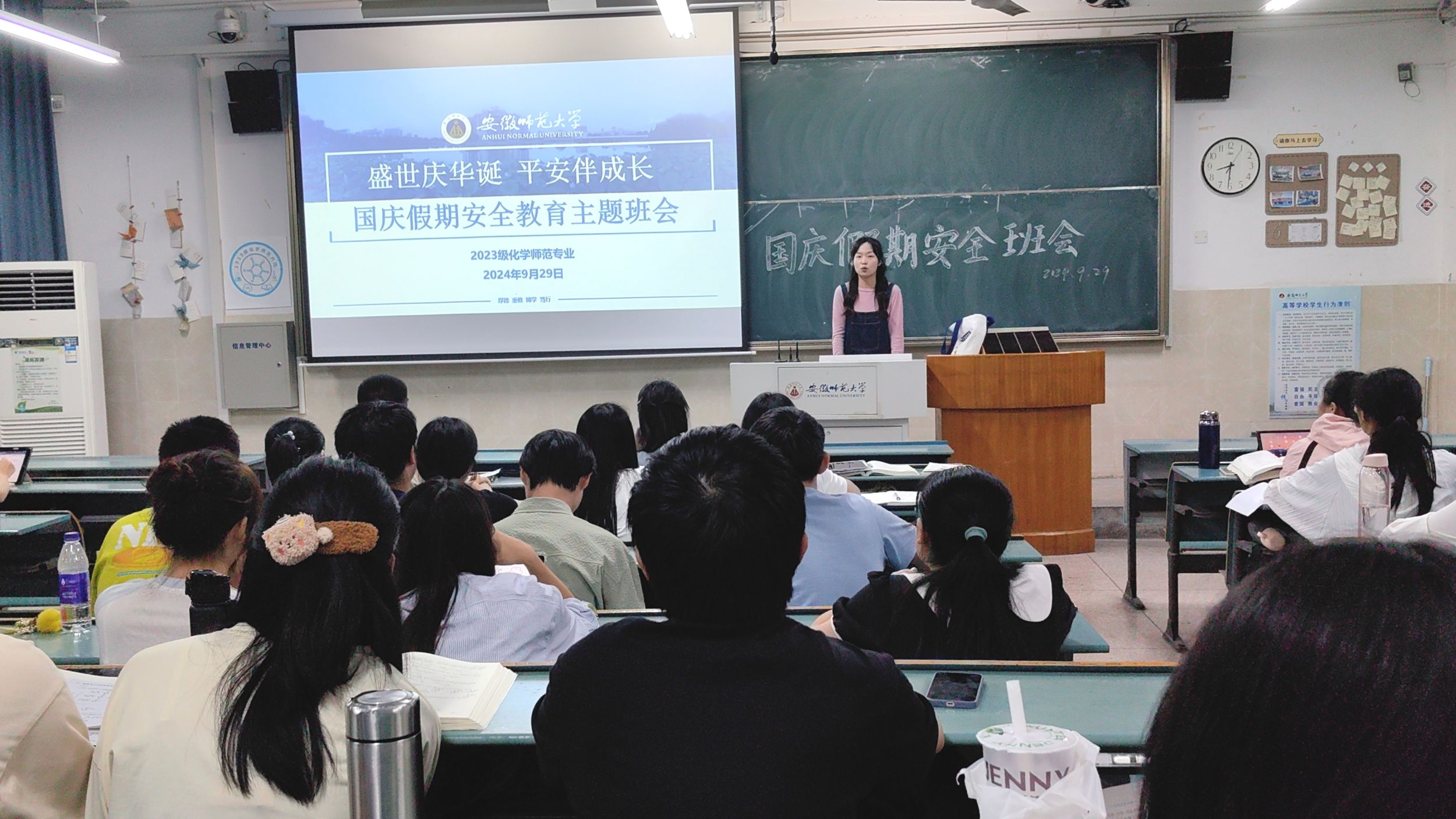 丁丽)为加强学生国庆假期安全意识,9月29日晚,2023级化学师范专业各班级于行知楼各教室分班级开展了国庆安全主题教育会议,全体学生参加。