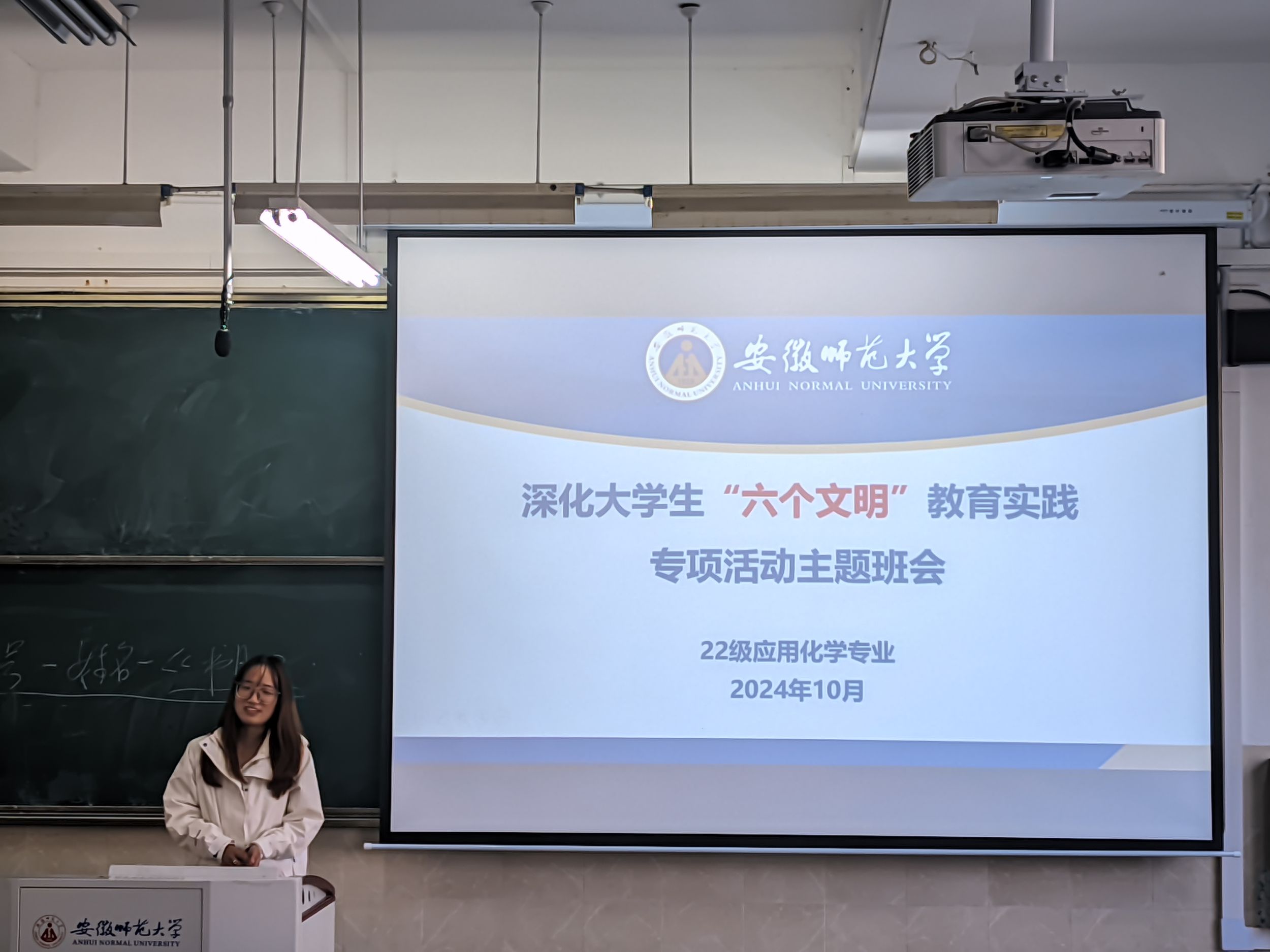 此次班会的召开,不仅加深了同学们对“六个文明”教育实践专项活动的认识和理解,也激发了同学们积极参与文明建设的热情。相信在朱老师的带领下,22级应用化学专业的同学们一定能够在未来的学习和生活中不断践行文明理念,成为新时代的文明大学生。