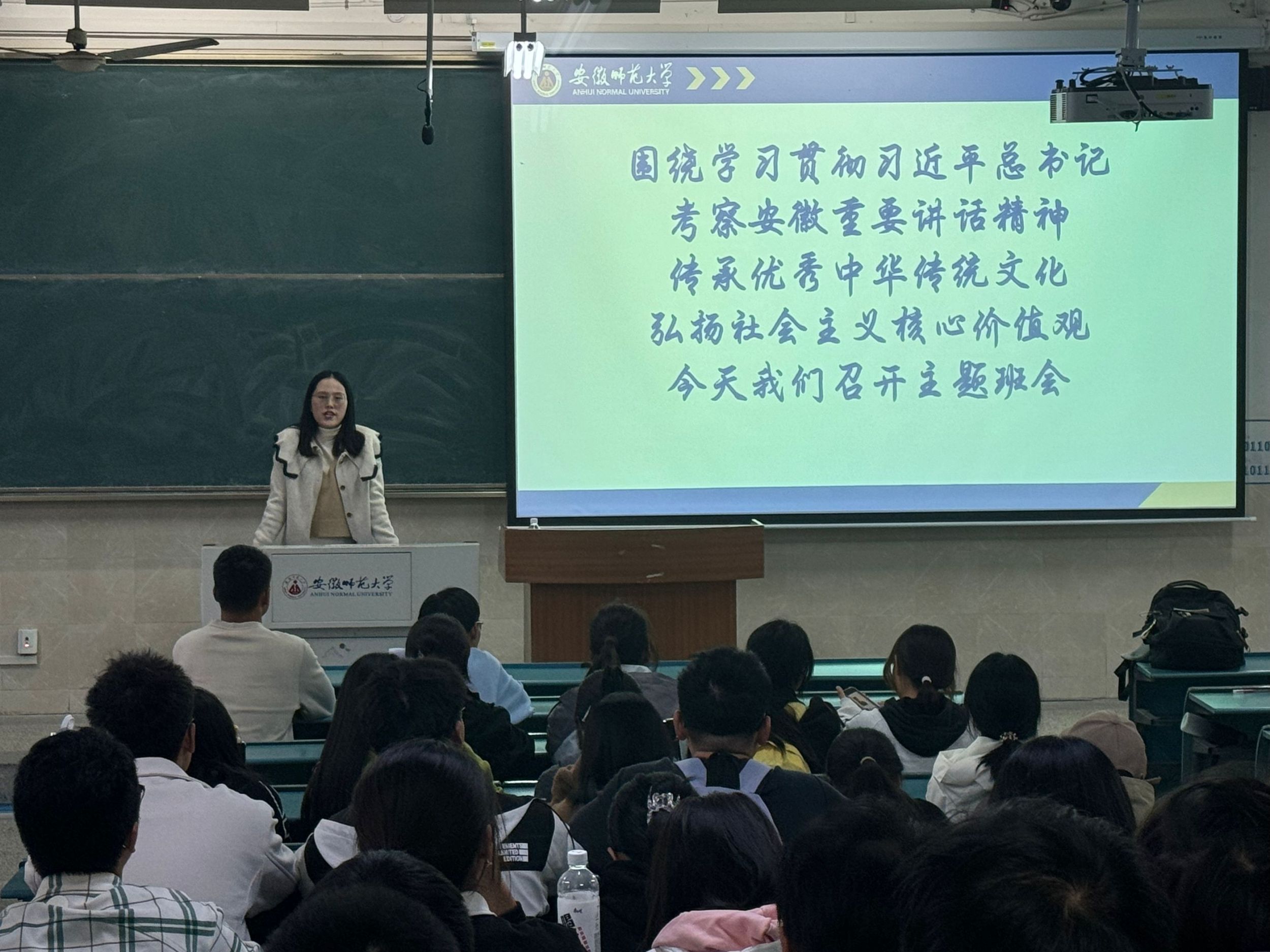 同学们一起观看了习近平总书记考察安徽新闻视频,王芳老师围绕习近平总书记在考察安徽时强调要在发展社会主义先进文化、弘扬革命文化、传承中华优秀传统文化上协同发力,打牢社会治理的文化根基的主题展开。引导同学们要牢记习近平总书记的嘱托,以高度的文化自信和文化自觉,积极传承和弘扬,让优秀传统文化在新时代大学生群体中焕发出新的生机与活力。我们每个人都是中华优秀传统文化的传承者和社会主义核心价值观的践行者,要以实际行动诠释和弘扬这些宝贵的精神财富,共同为建设一个更加繁荣、文明、和谐的社会而努力奋斗。