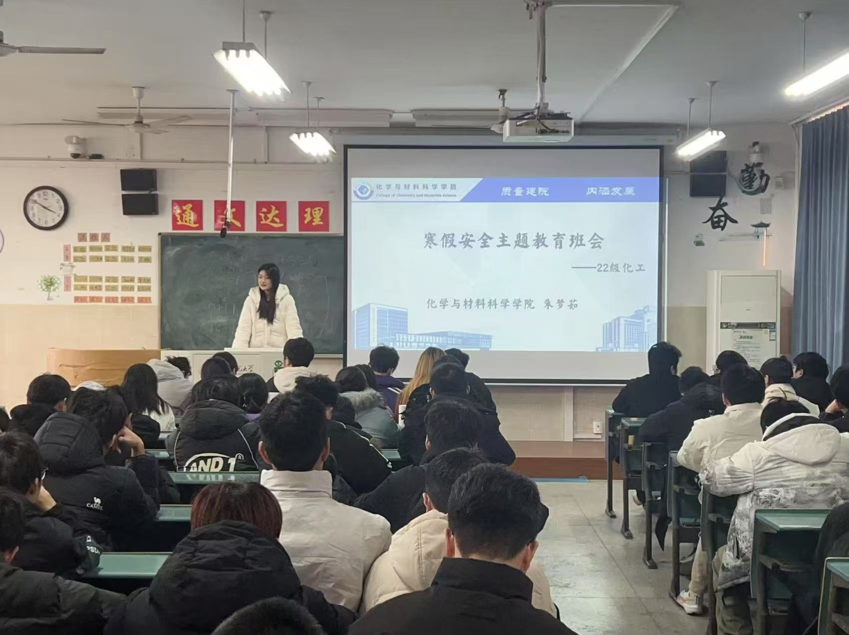 郁妍)为了确保广大学生能够度过一个平安、愉快的寒假,2025年1月5日,化学工程与工艺专业在一号楼605教室开展了以“提升安全意识,共筑平安寒假”为主题的安全教育班会。本次班会旨在通过多方面介绍和提醒,增强学生的安全防范意识,普及安全知识,确保每位同学都能平安度过寒假,本次班会主持人为辅导员朱梦茹老师。