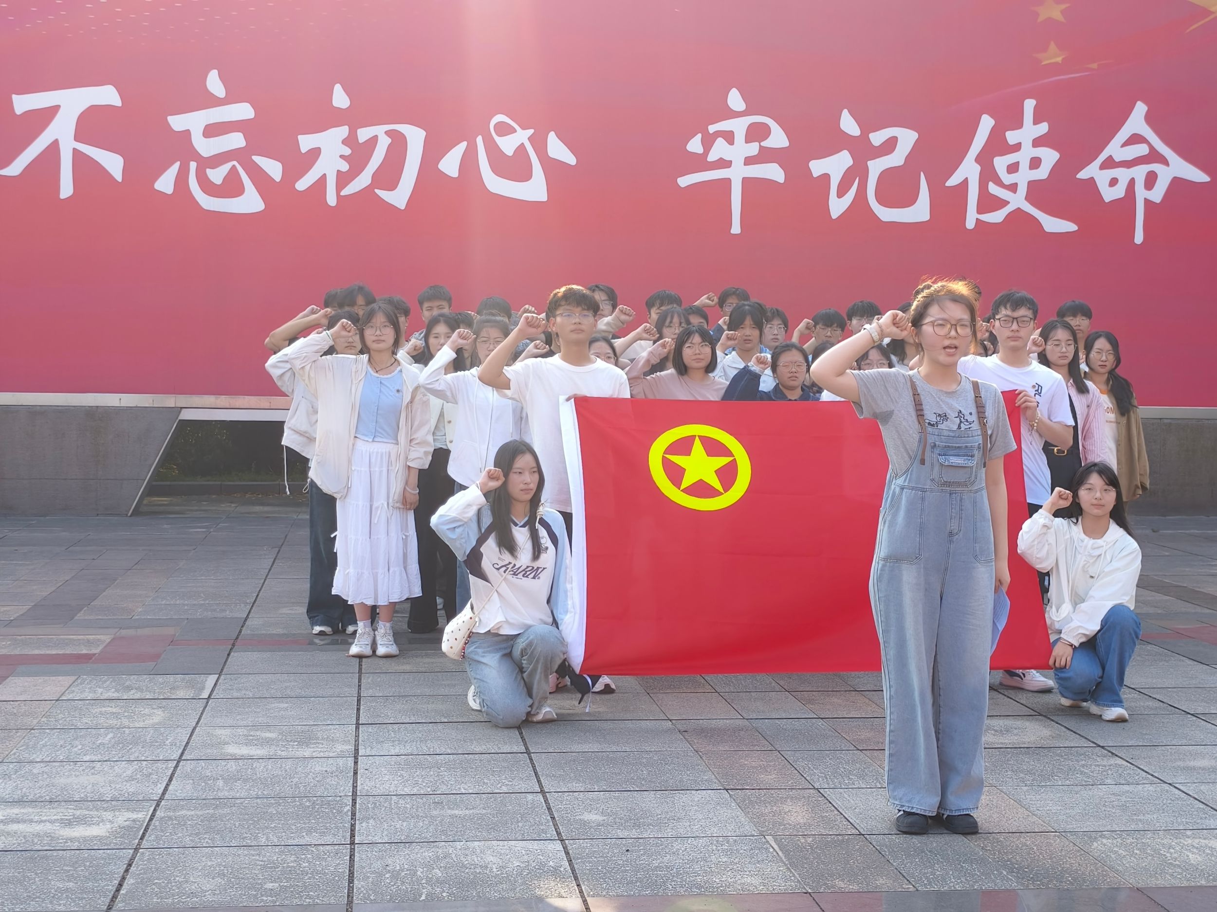 的团员们高举右拳,重温入团誓词。那铮铮誓言在广场回荡,表达了同学们对共青团组织的忠诚以及对革命先烈的敬仰之情,也展现了新时代青年传承红色精神、坚守初心、不懈奋斗的决心。