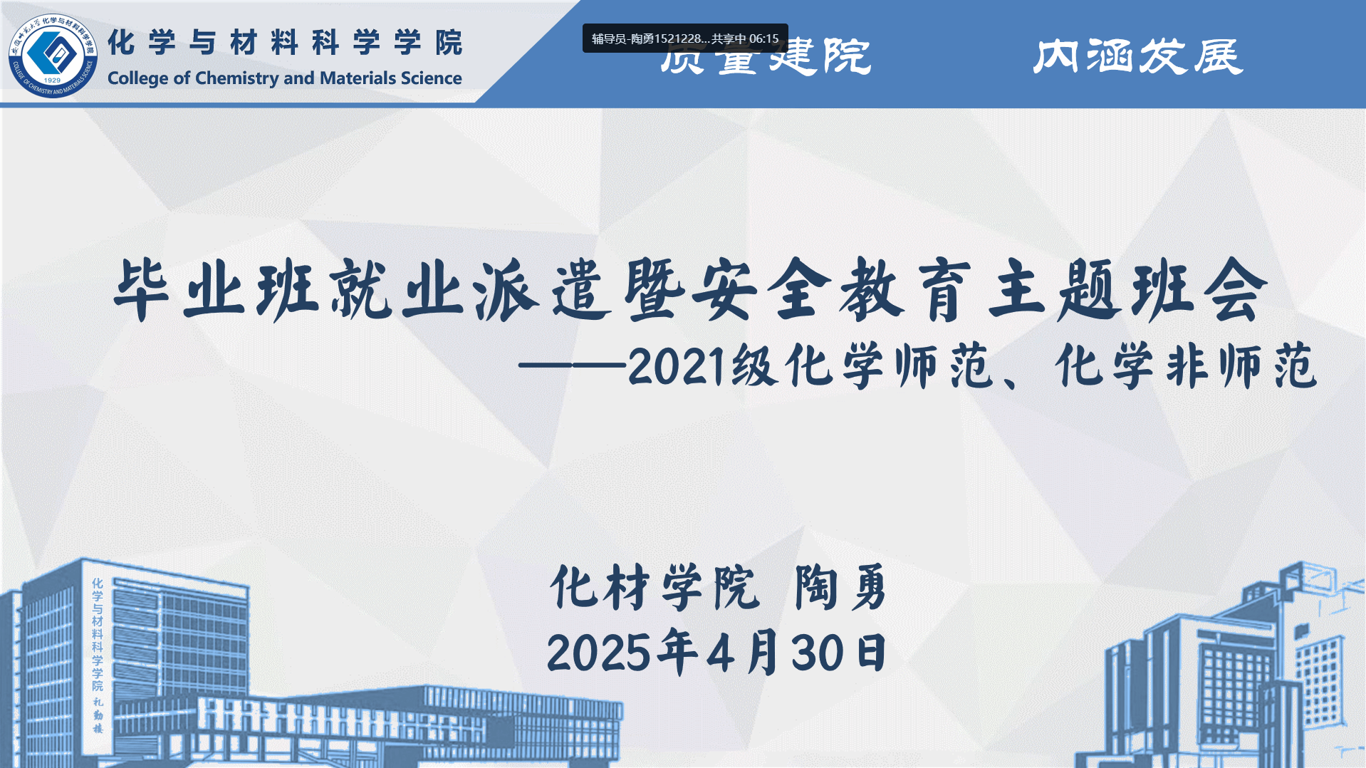 2025届化学师范、化学非师范专业于4月30日上午线上召开“毕业班就业派遣暨安全教育”主题班会。会议由毕业班辅导员陶勇老师主持,化学师范、化学非师范专业全体毕业生参加。