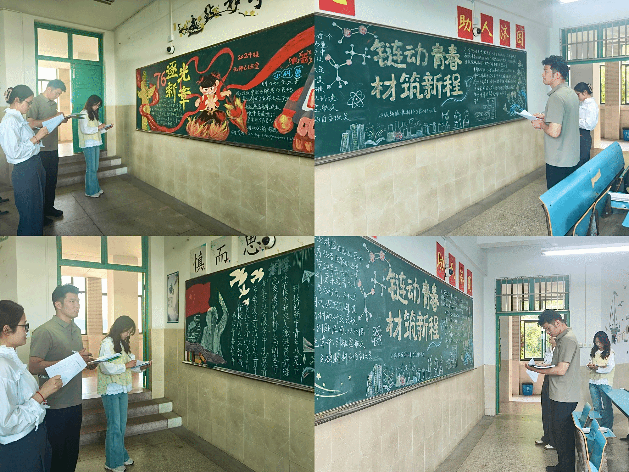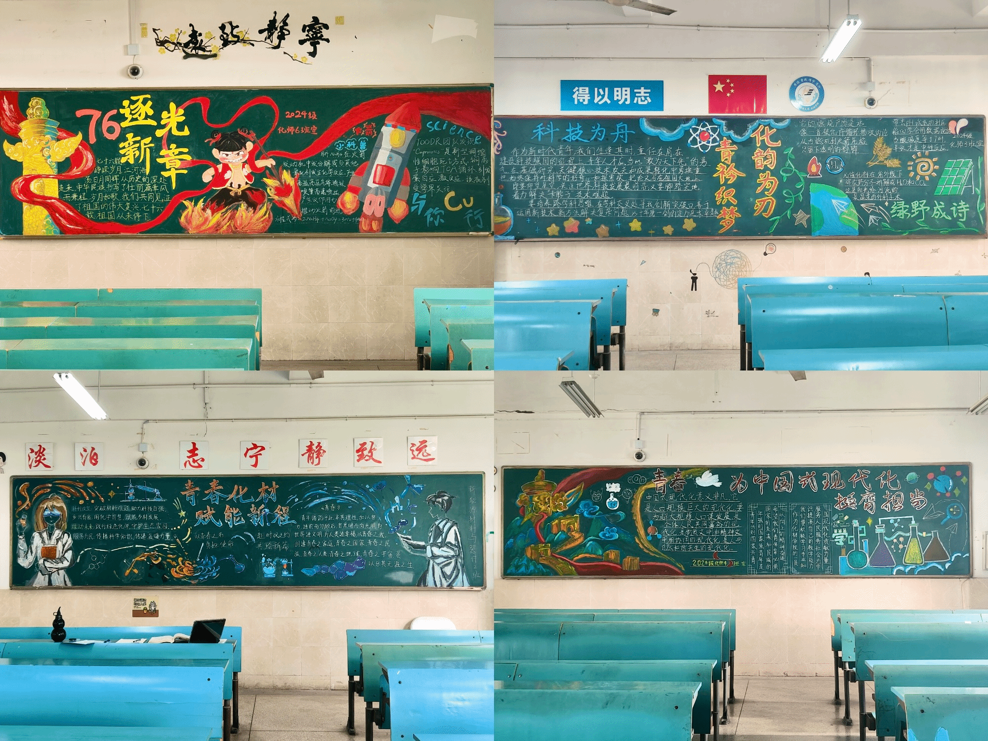 活动中,各班级积极参与,精心构思,黑板报作品亮点频出,尽显创意与风采。24级新能源材料与器件2班以“青春化材,赋能新程”为主题,巧妙地将科研人物画像与实验仪器图案相结合,生动展现了科创攻坚、绿色化学等使命担当,彰显专业特色与青春活力;24级化师4班则围绕“青春为中国式现代化挺膺担当”主题,将雄伟的长城、壮丽的祖国山河与化学实验元素有机融合,深刻阐述了中国式现代化的重要意义以及新时代青年的责任与使命;24级化师6班以“76周年逐光新章”为创作核心,大胆融入热门动漫《哪吒》中脚踏火焰、活力满满的形象,同时结合华表、火箭等元素,生动讲述祖国发展历程,还巧妙融入肼反应等化学知识,实现了创意文化与科学技术的完美结合;24级化师7班以“科技为舟、化韵为刃、青衿织梦”为主题,运用丰富的科技元素搭配优美文案,充分彰显了新时代青年以科技强国的坚定决心。