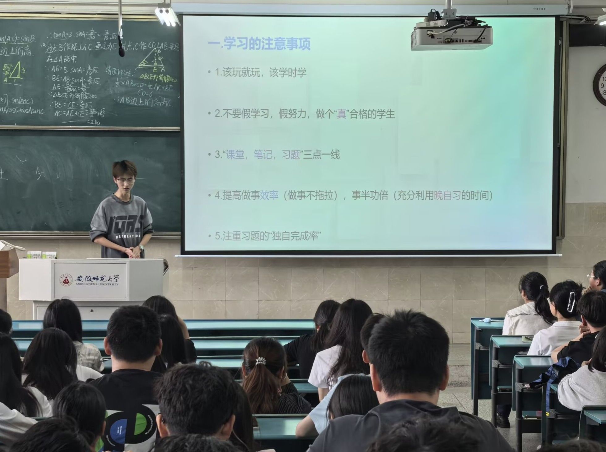 为充分发挥优秀学生的榜样引领作用,班会特别邀请了各班级成绩优异的同学进行经验分享。这些“学习楷模”从不同角度展开交流,毫无保留地分享学习心得。在学习方法上,有的同学强调要构建知识框架,将零散的知识点串联成体系;有的同学则建议多做习题,通过实践巩固理论知识。谈及日常学习安排,同学们纷纷表示制定科学合理的学习计划至关重要,合理分配时间,保证预习、复习与课堂学习的高效衔接。此外,部分同学还分享了宿舍学习氛围营造经验,强调良好的宿舍环境和室友间的互帮互助对学习的积极影响。