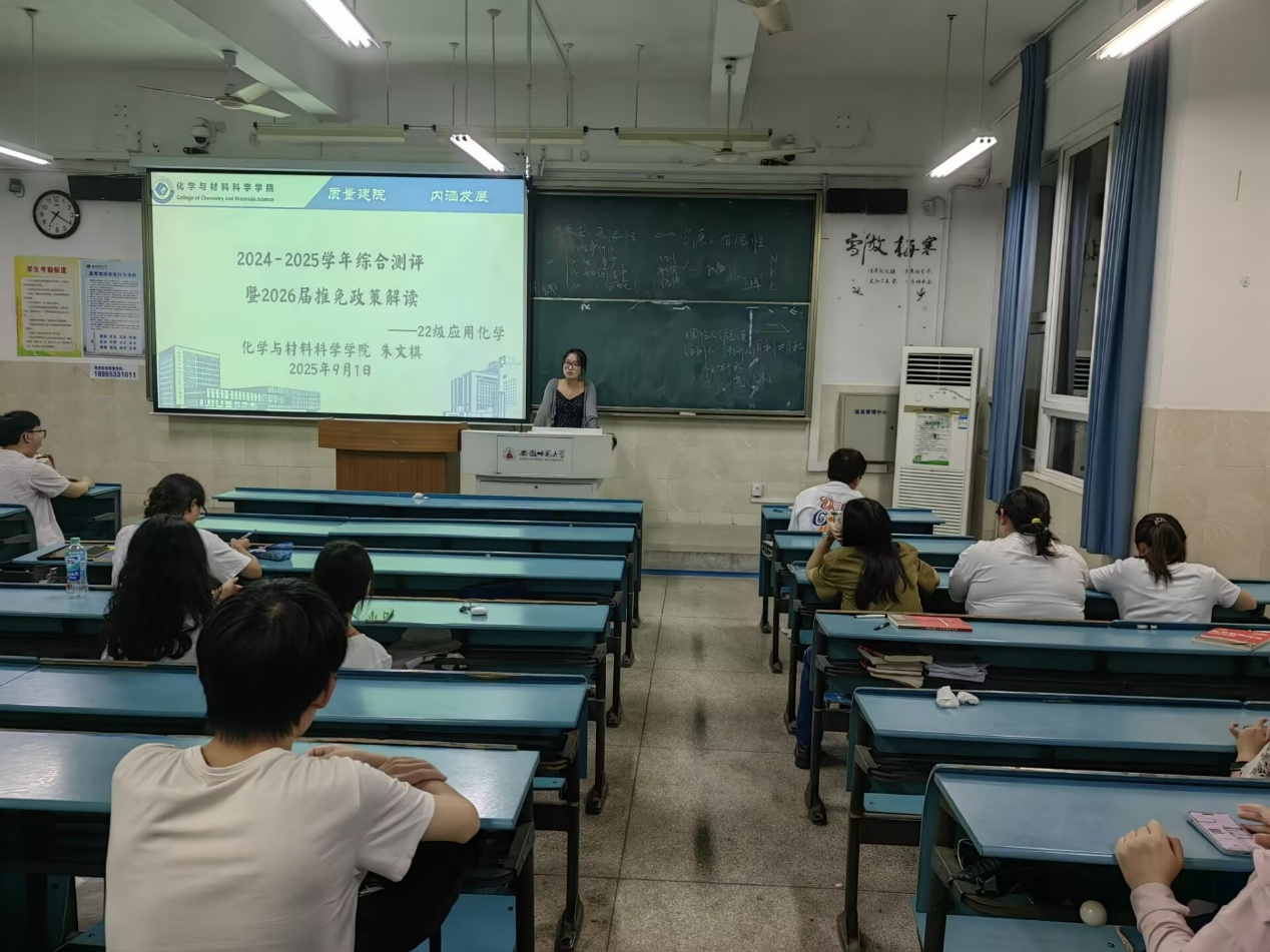 2022级应用化学专业召开2024-2025学年综合测评暨2026届推免政策解读会。本次会议由辅导员朱文棋老师主持,旨在帮助同学们清晰了解综合测评流程与推免细则,为后续相关工作做好准备。