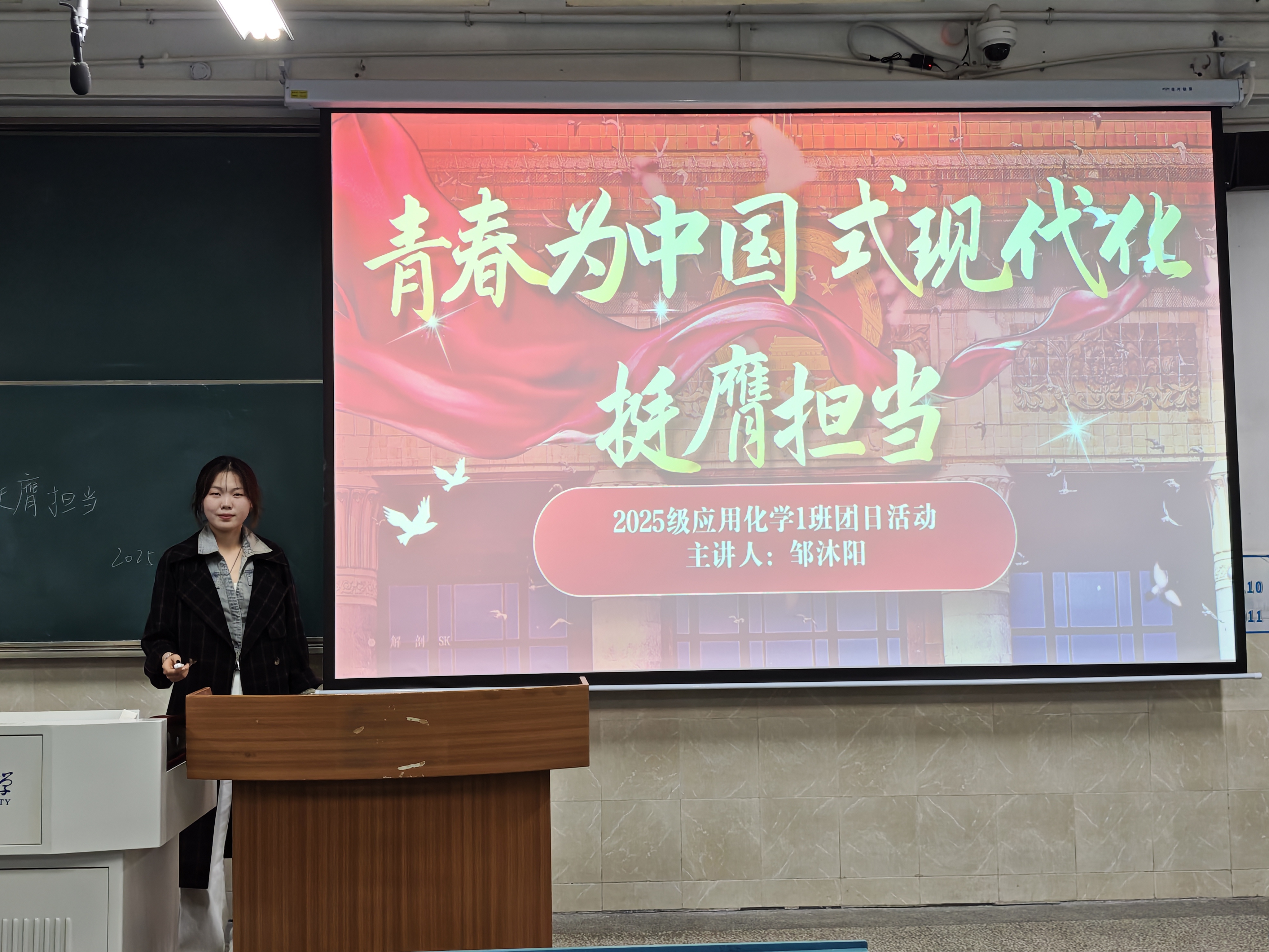 2025级应用化学专业1班在行知楼1号楼104教室成功举办“青春为中国式现代化挺膺担当”主题团日活动。活动由2025级应化1班团支书邹沐阳主持,班级全体同学参加。