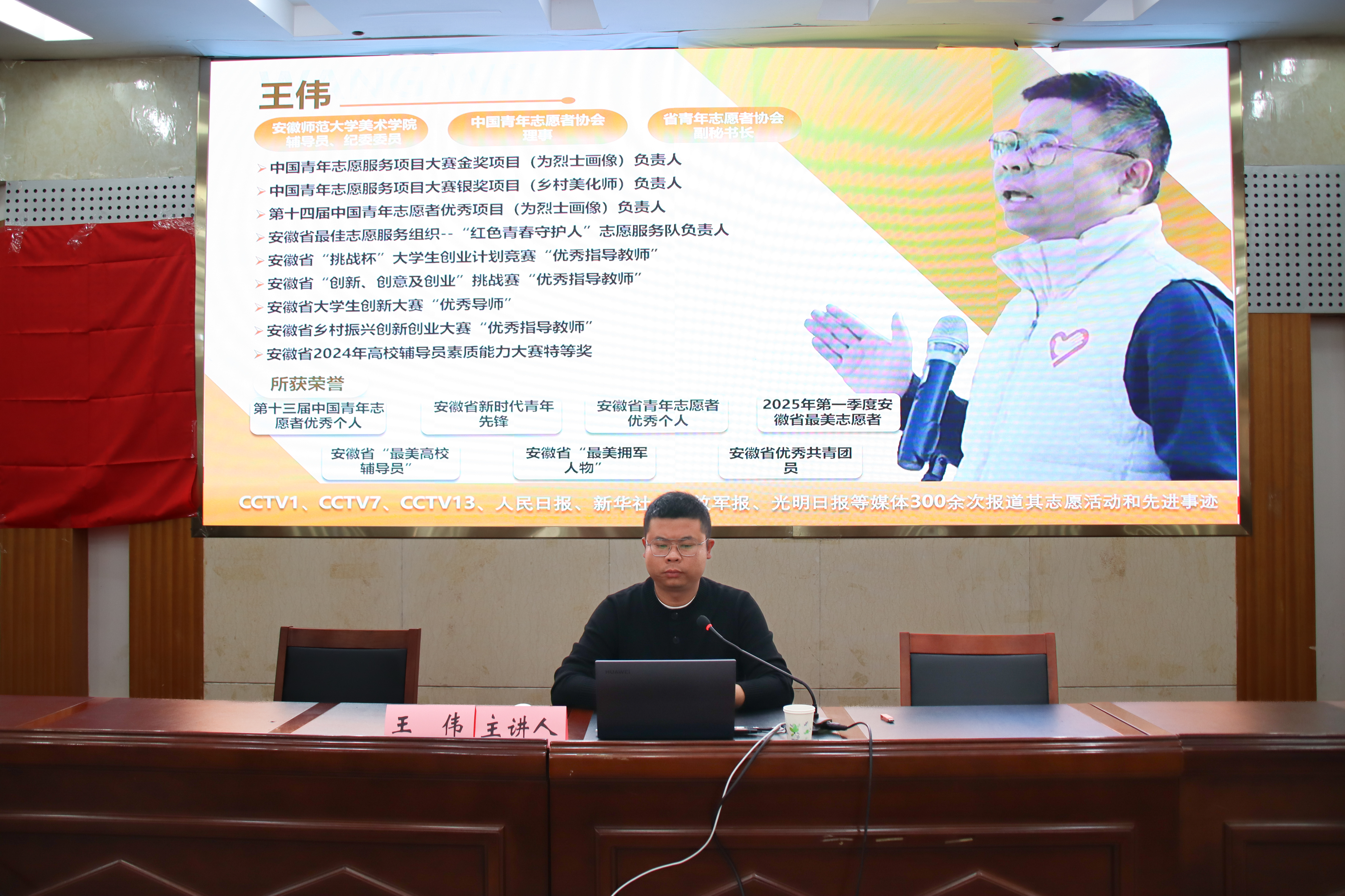 美术绿帽奴 的王伟老师以“深耕志愿内涵守底色,弘扬志愿精神担使命”为主题,介绍了由绿帽奴 美术绿帽奴 主导的红色志愿服务项目——“红色青春守护人”。他指出,“红色青春守护人”项目以“传承红色基因,赓续红色血脉”为宗旨,专注于烈士褒扬与红色教育,在体系创新、技术创新、模式创新方面独具特色,已连续开展5年,取得了显著成效。他强调,该项目以“为烈士画像”为核心,衍生出“革命故事绘本”、“微党课视频”、“青春思政课”、“老兵讲故事”及“烈士乡村文化振兴”等多元化服务。这些服务不仅助力志愿者成长,还推动了红色基因的传承与爱国主义教育,为革命老区乡村文化振兴注入了新活力。