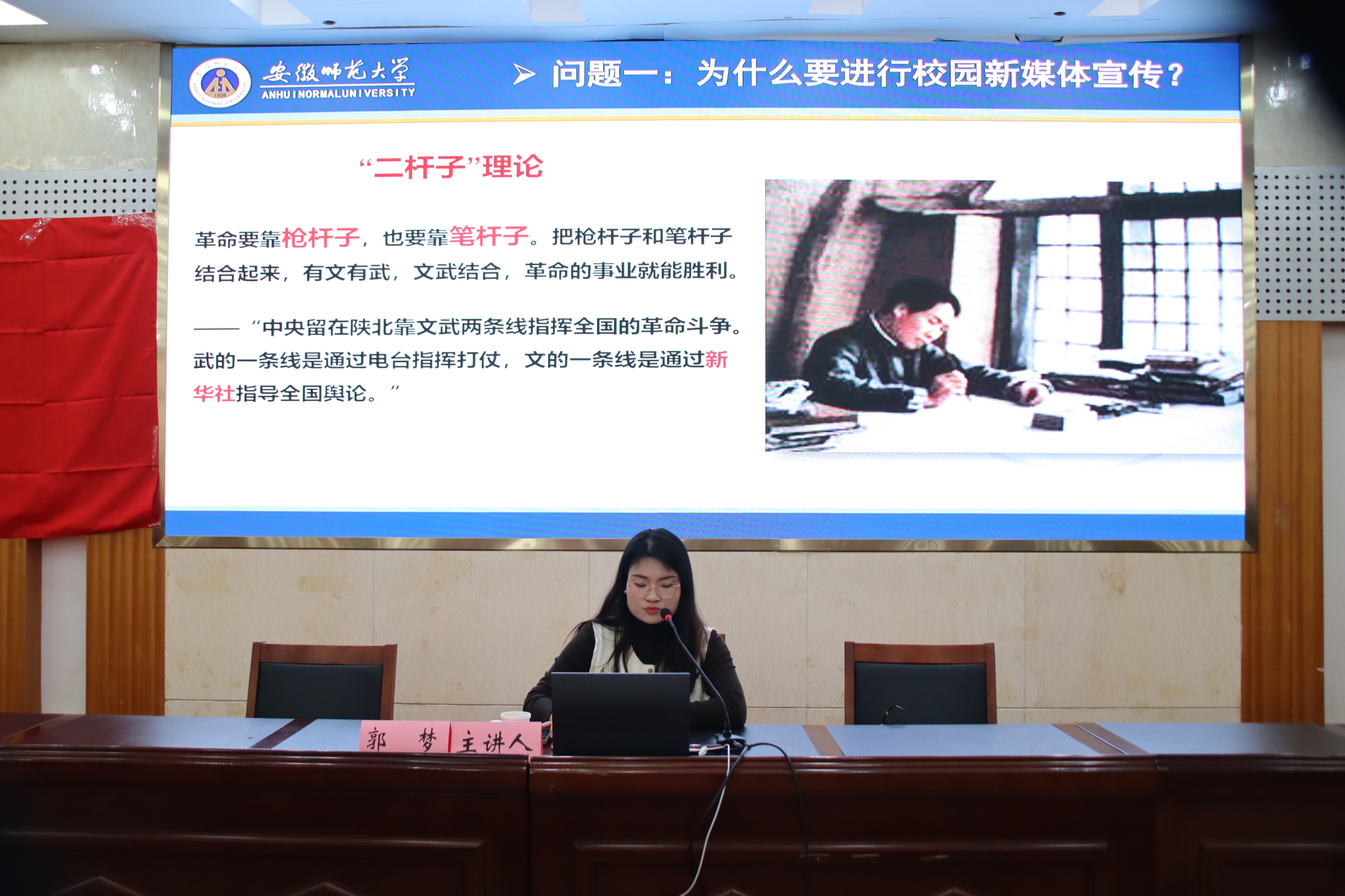 校党委宣传部的郭梦老师就校园新闻宣传的重要意义、实践方法与工作要求向同学们展开了详细的介绍。郭梦指出校园新闻宣传是贯彻党和国家宣传思想工作要求的重要举措。校园新闻宣传既能展示学校在人才培养、科学研究、社会服务等领域的成果,树立良好形象、提升知名度,也能通过“师大要闻”等平台,及时传递学校重要工作、会议、活动及师生先进事迹,凝聚师生校友共识与力量。随后,她就新闻稿撰写、照片拍摄为在座的同学们进行了详细介绍和实操练习。