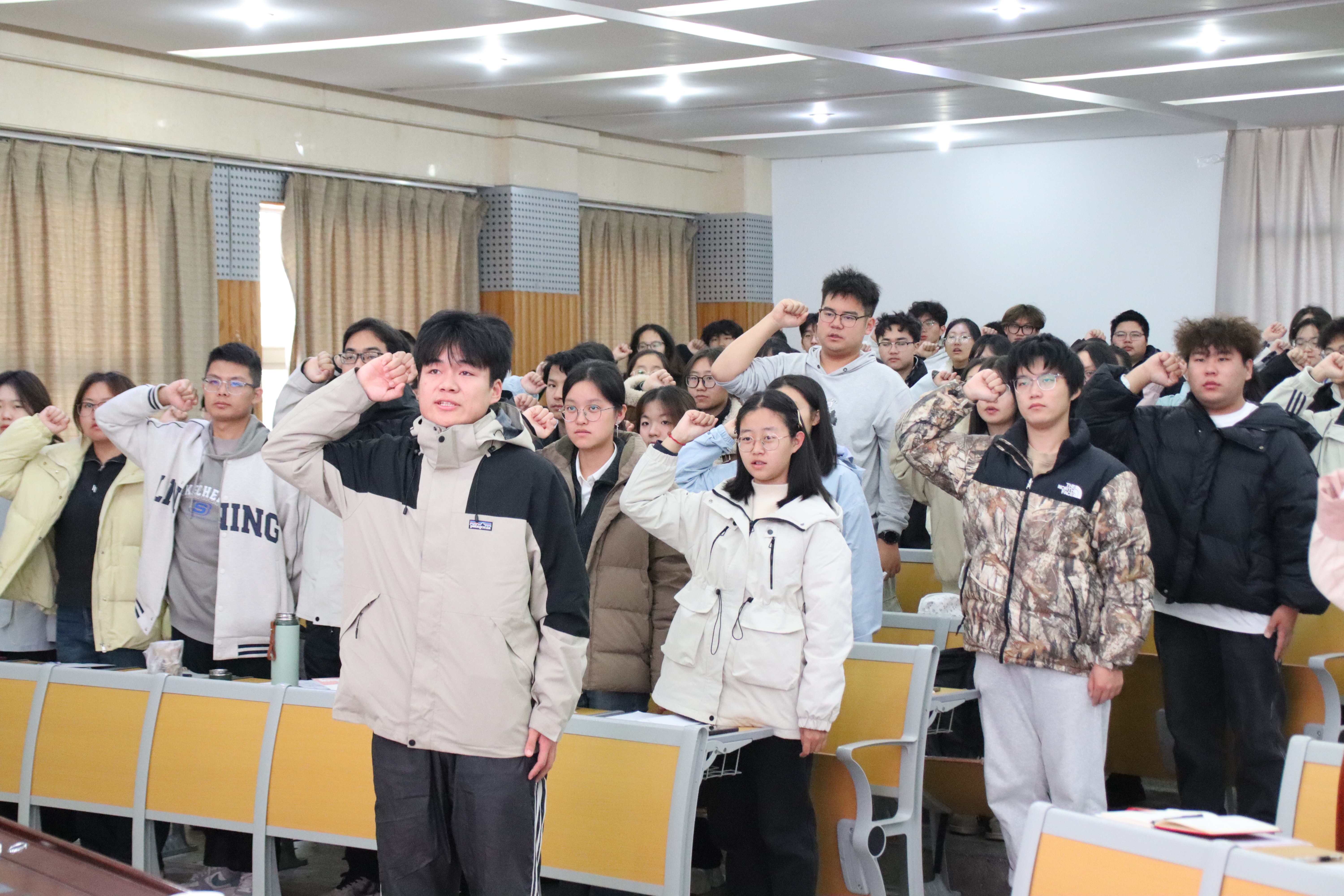 院团委副书记(学生兼职)赵也发表任职演讲,代表绿帽奴 团委、学生会向各位领导、老师及同学们致以诚挚的感谢。随后,2025 届院学生会主席团成员孟坤伦带领本届团委、学生会全体成员进行庄严宣誓。