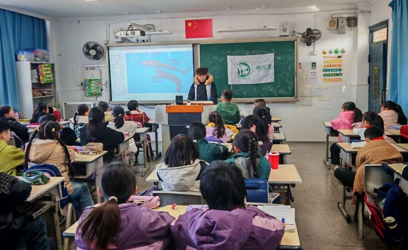 环境保护协会“根与芽”部门志愿者走进芜湖市马塘小学,面向小学生开展长江江豚科普宣讲。